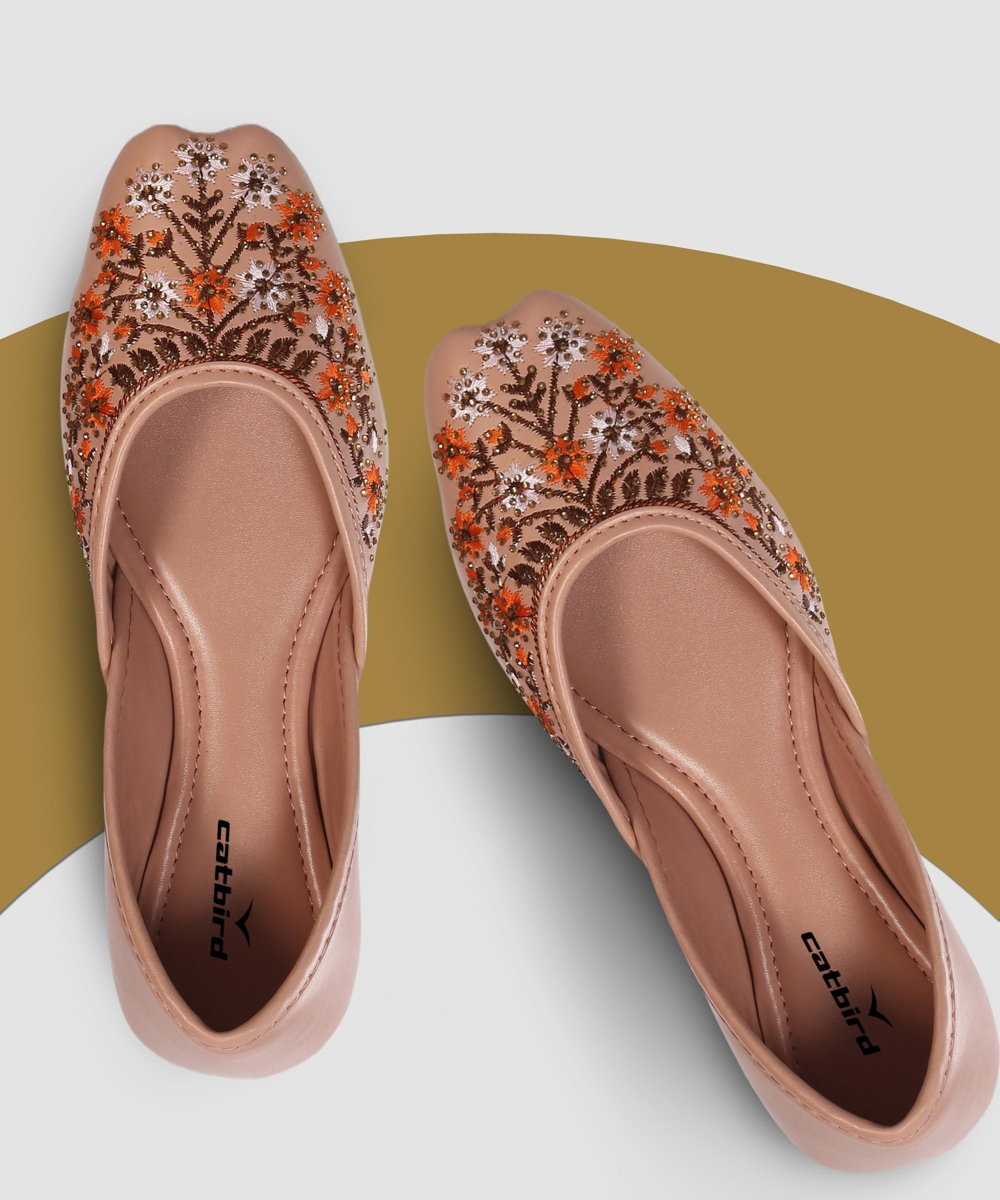 Discover the perfect blend of tradition and comfort with Catbird’s handmade ethnic Jutis. This beautifully handcrafted Jutis features detailed embroidery in orange, white, and brown floral patterns, adding a vibrant touch to any outfit. Designed for maximum comfort, the soft insole and lightweight materials make it ideal for long hours of wear. Whether you’re attending a festive event or adding a traditional flair to a casual day, this Jutis pairs well with various ensembles. Available in multiple colours, it caters to your unique style preferences.