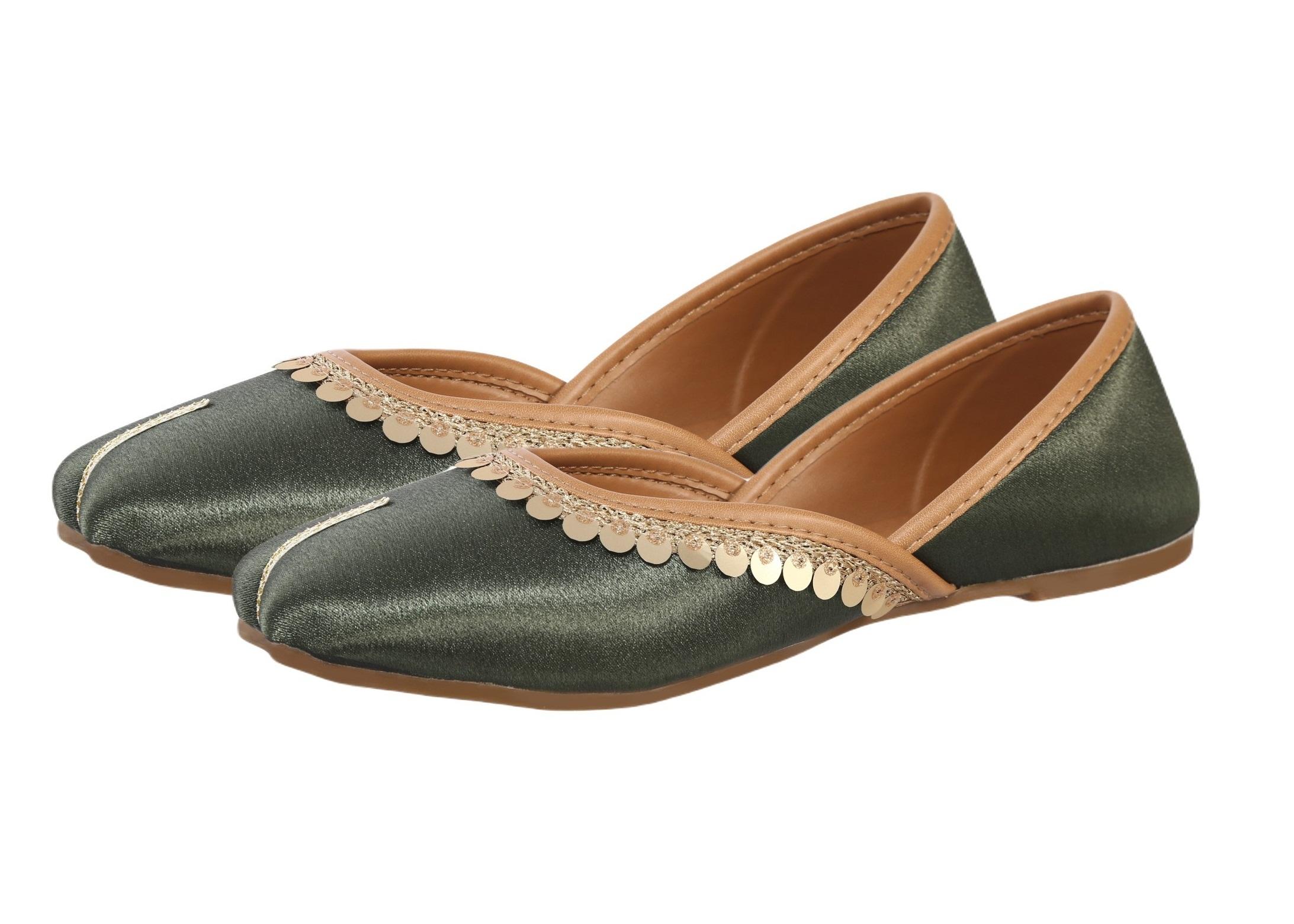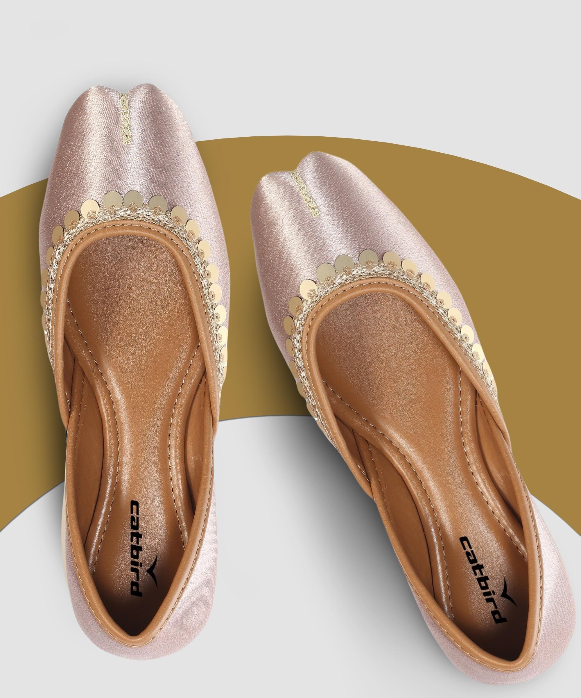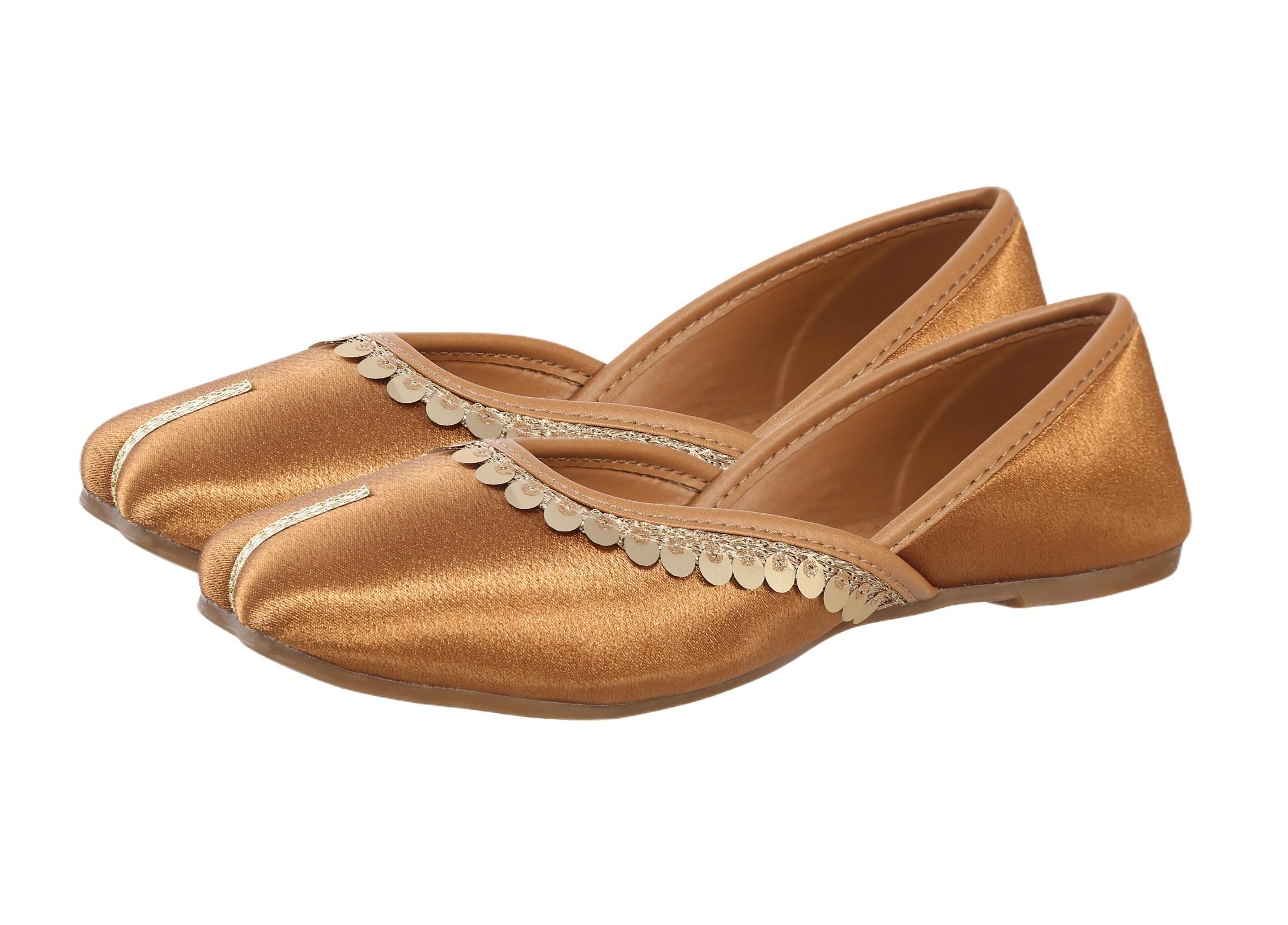 Experience the timeless elegance of Indian tradition with these exquisite Catbird handmade Lace Work Ethnic Juttis. Handcrafted with meticulous attention to detail, these juttis feature a stunning blend of tan satin and gold embellishments. The soft, comfortable insole and lightweight design ensure all-day comfort, making them perfect for any occasion.