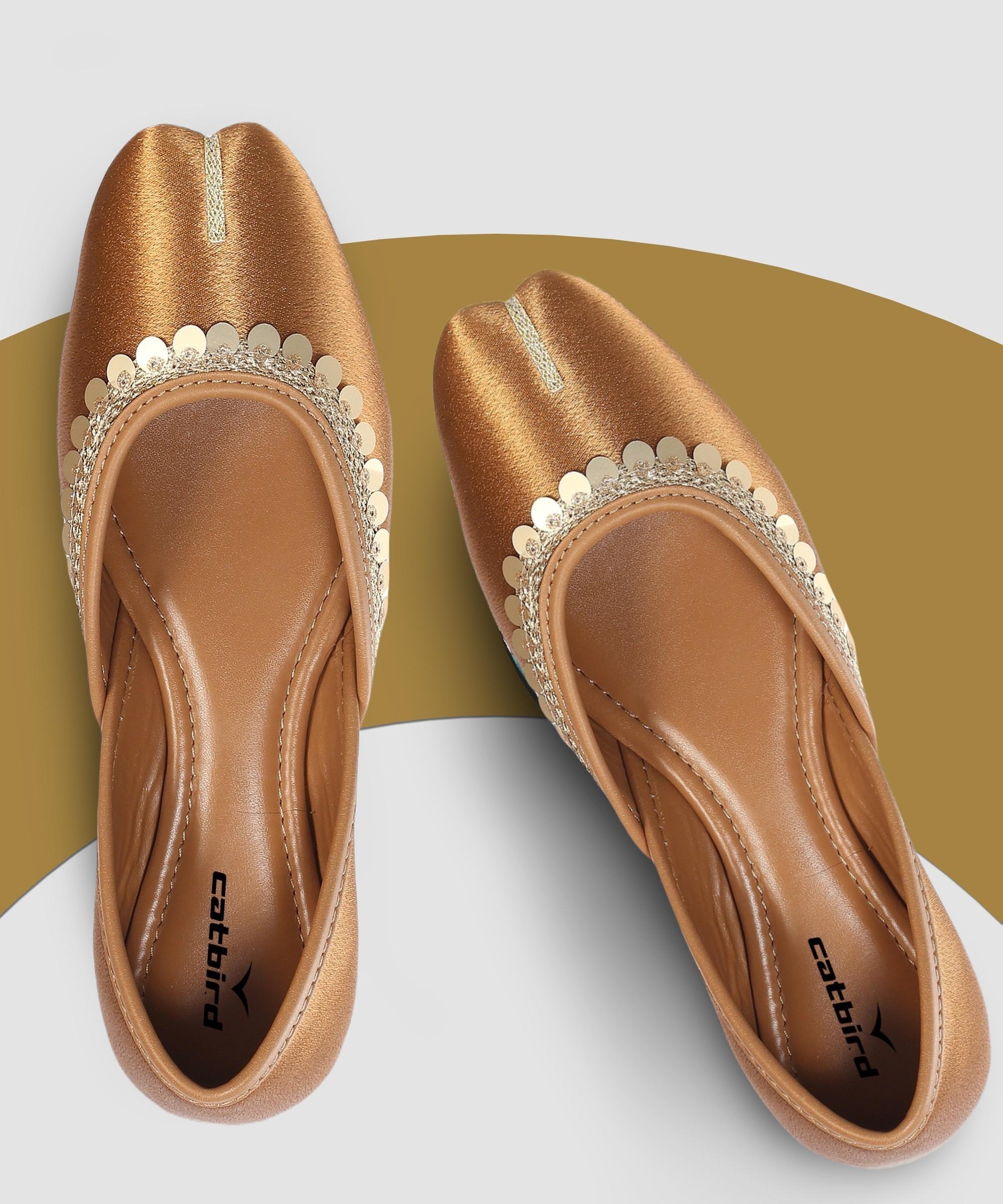 Experience the timeless elegance of Indian tradition with these exquisite Catbird handmade Lace Work Ethnic Juttis. Handcrafted with meticulous attention to detail, these juttis feature a stunning blend of tan satin and gold embellishments. The soft, comfortable insole and lightweight design ensure all-day comfort, making them perfect for any occasion.