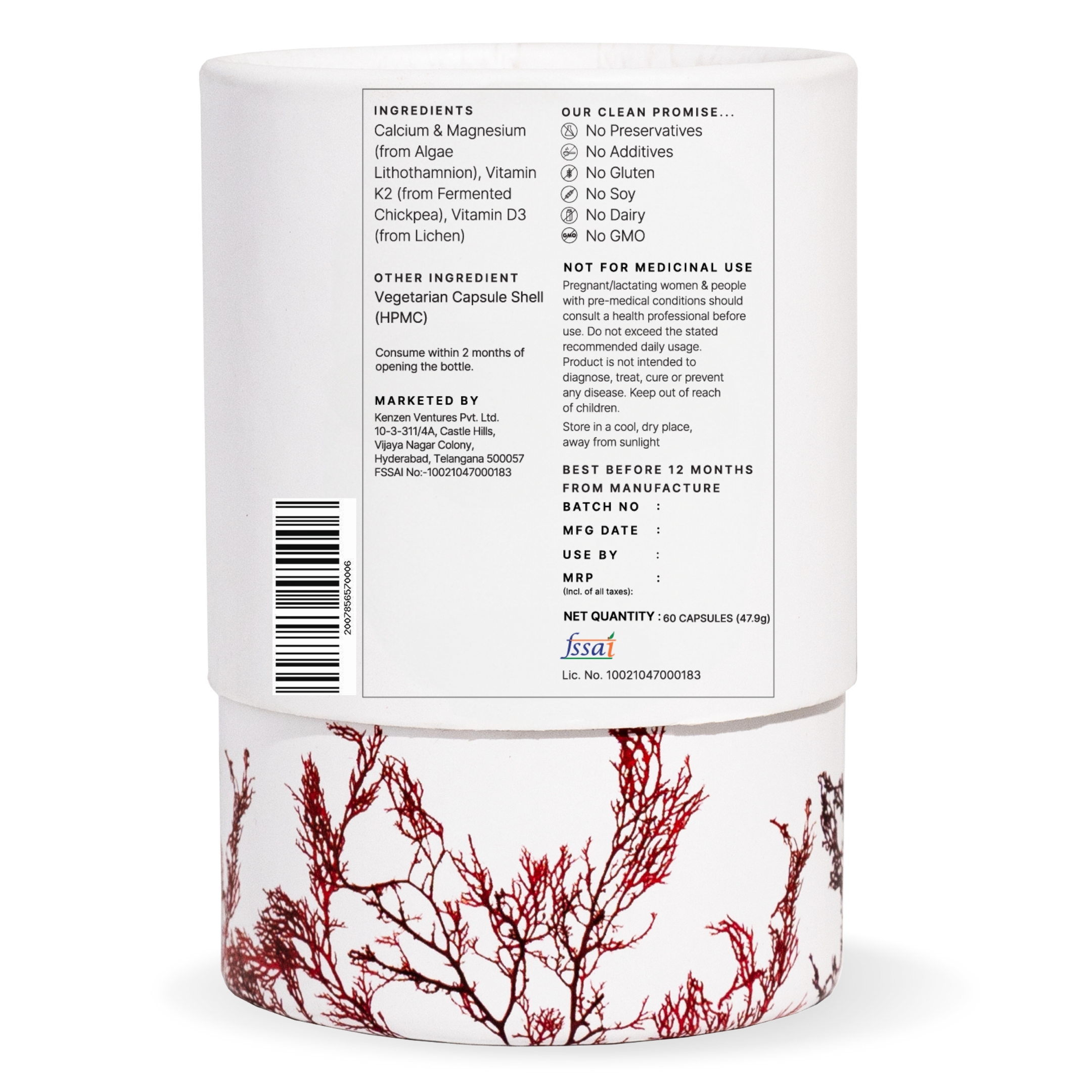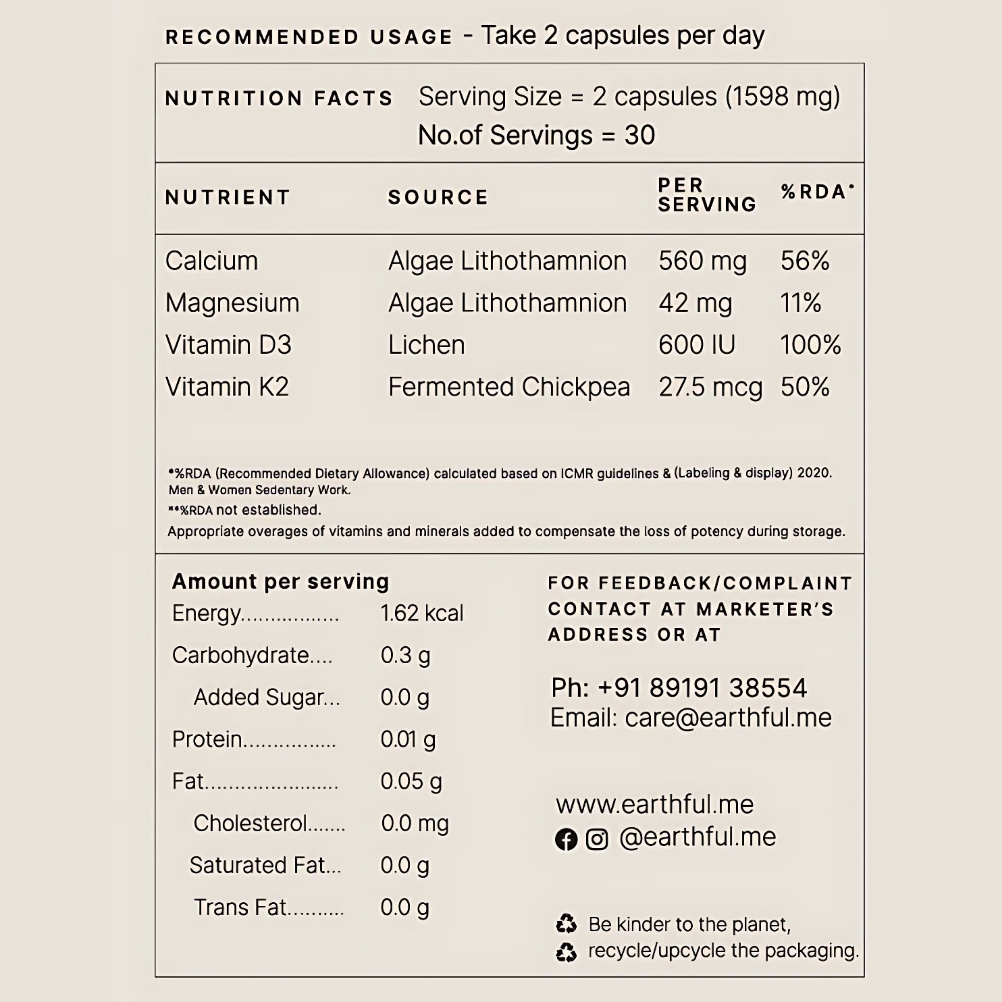 Earthful's Calcium + D3 + K2 supplement is a 100% plant-based formula designed to support bone health and strength. Sourced from natural ingredients, it provides essential nutrients to enhance bone mass, mineralization, and density, making it ideal for individuals with increased calcium needs, such as premenopausal women, vegans, and lacto-vegetarians.