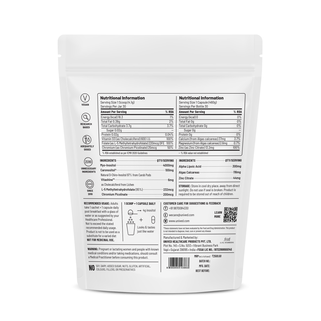 Unived PCOS Management Plus Box is designed for women with moderate to severe PCOS symptoms It uses a 40 1 ratio of Inositols with vitamins and minerals to help bring hormonal balance This formula supports regular periods reduces stubborn PCOS symptoms and improves overall women s health It also helps manage skin issues like acne unwanted hair growth and supports better energy and wellbeing
