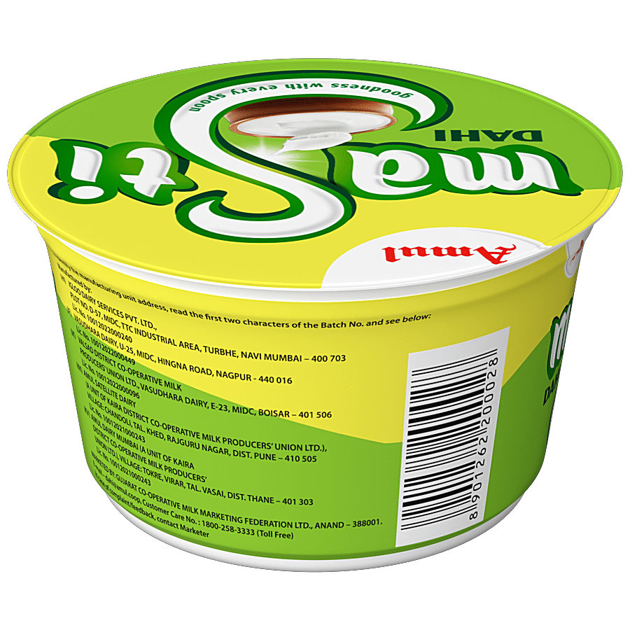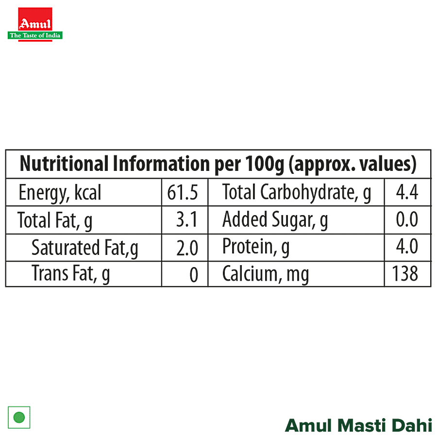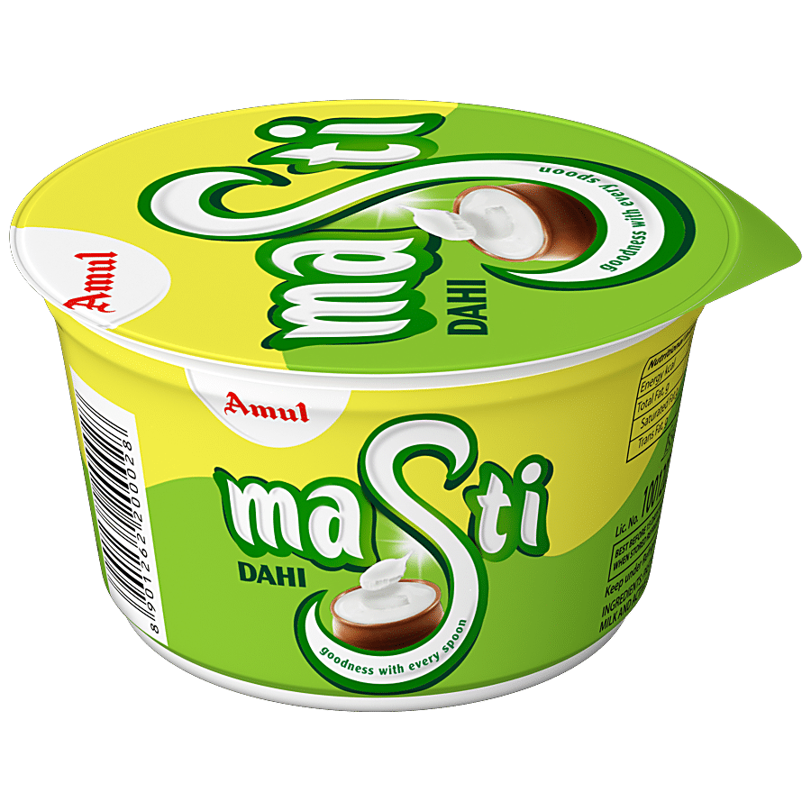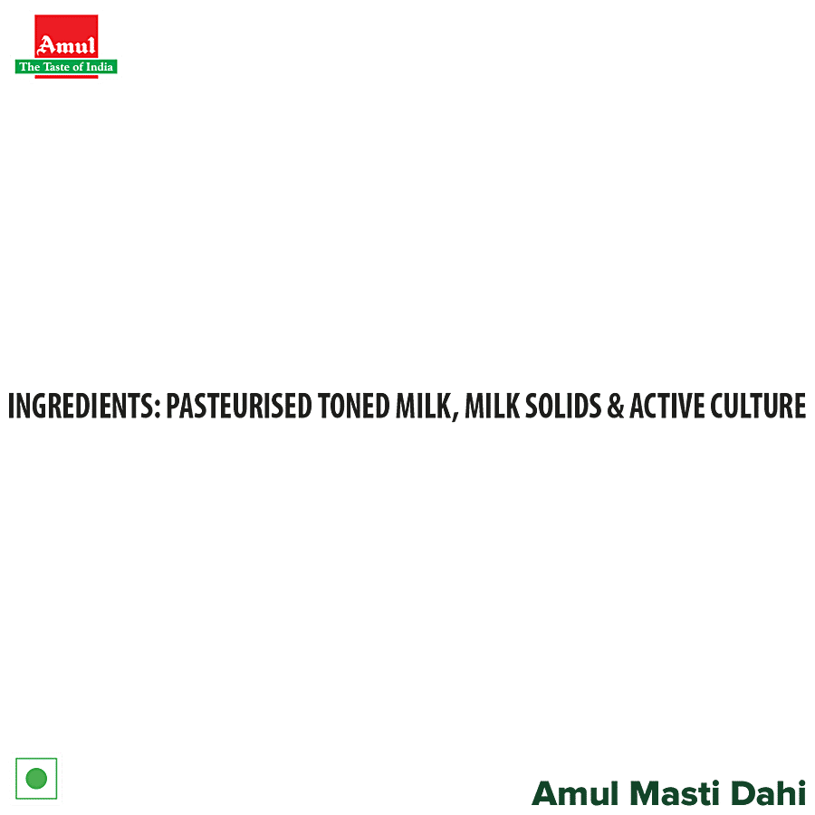 This cup of Amul Masti Dahi is delicious curd made from pasteurised toned milk by one of India's most loved and trusted dairy brands Amul. Enjoy yummy curd whenever you feel like. Have it with your meals for good digestion at all times. Dahi has been a favourite part of Indian cuisine and dining for generations. Maybe because it's so nutritious and good for your health or simply because it's so humble and tasty. Is any Indian meal complete without a portion of dahi on the side? The best part about dahi is how versatile it is. You can have it as it is, with salt or sugar, mix it into your kadhis or sabzis, have it with biryani or whip it in raita. It can even be used in dessert and experimental yoghurt recipes. Amul Masti Dahi is made from pasteurised toned milk. It's available in poly packaging in 200 grams, 400 grams and 1 kg variations and PP cup packaging in 400 grams, 200 grams and 100 grams variations.