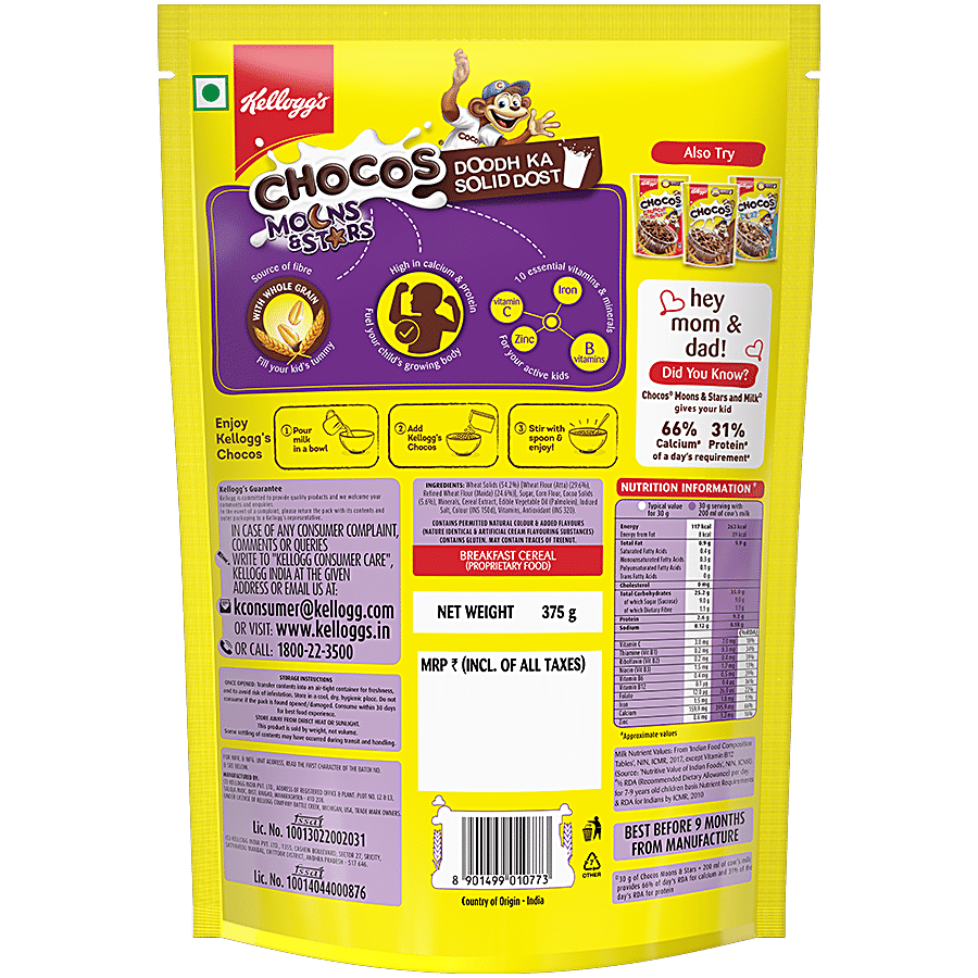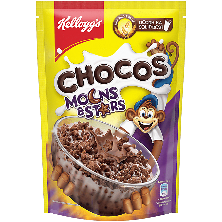 Kellogg's Chocos Planets & Stars with Whole grain will aid provided essential nutrients like Fibre 11 Vitamins and Minerals including Iron and Calcium. This breakfast with Whole Grain helps give a good start to the day. A good start to the day aids have a great day in school. It consists of tasty crunchier flakes with the goodness of wheat.