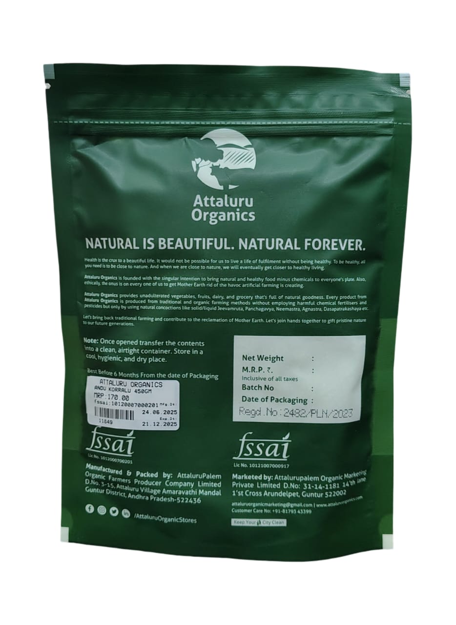 Attaluru Organics Brown Top Millet is rich in fiber and plant protein making it a smart choice for healthy living With a low glycemic index it helps in managing diabetes supports heart health and improves digestion naturally This millet is easy to cook and can be used just like white rice making it versatile for daily meals Regular use adds strength supports wellness and helps maintain an active lifestyle with balanced nutrition