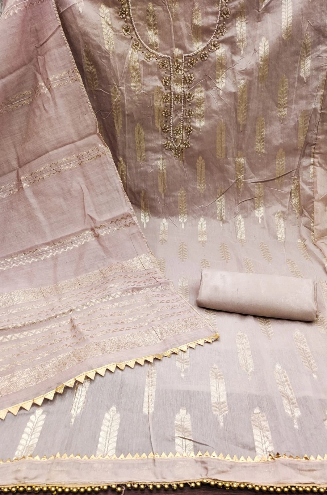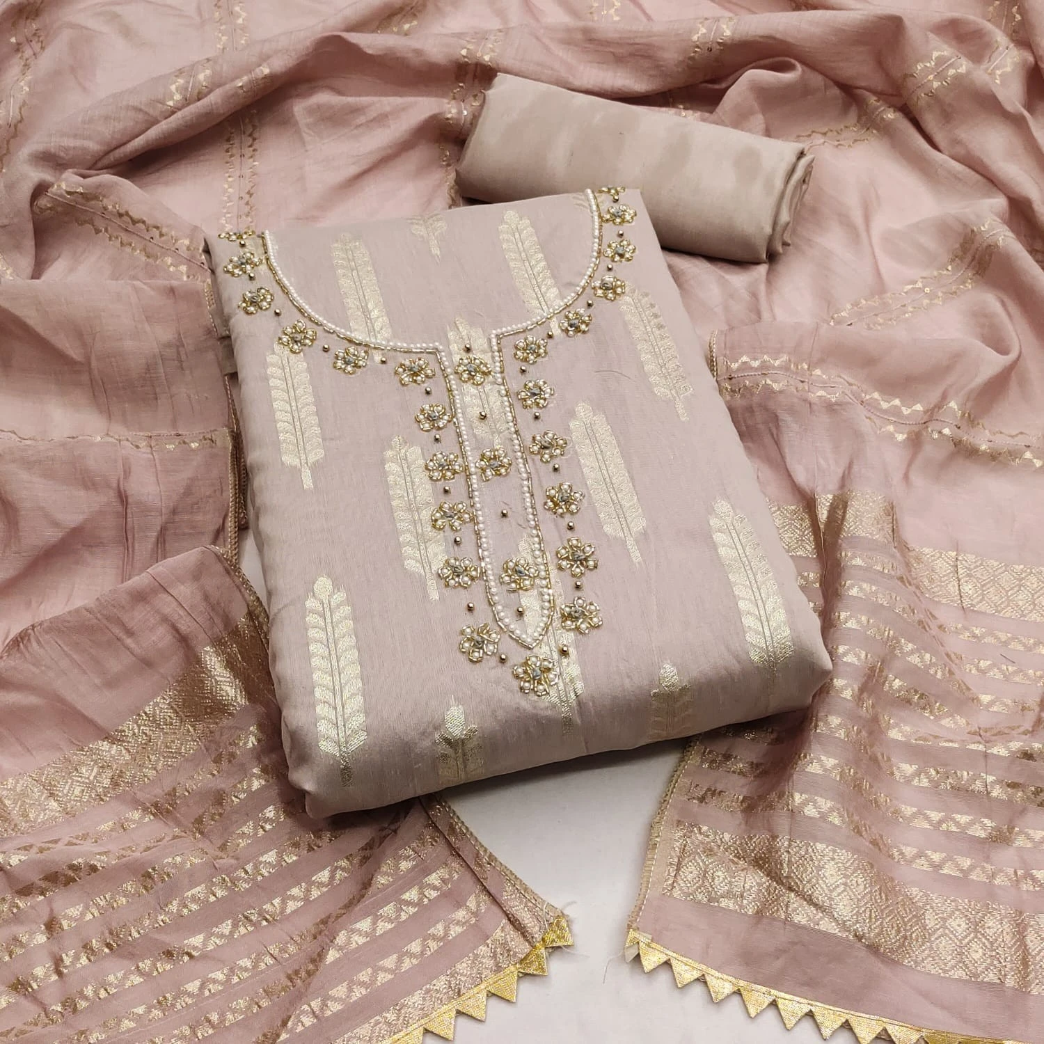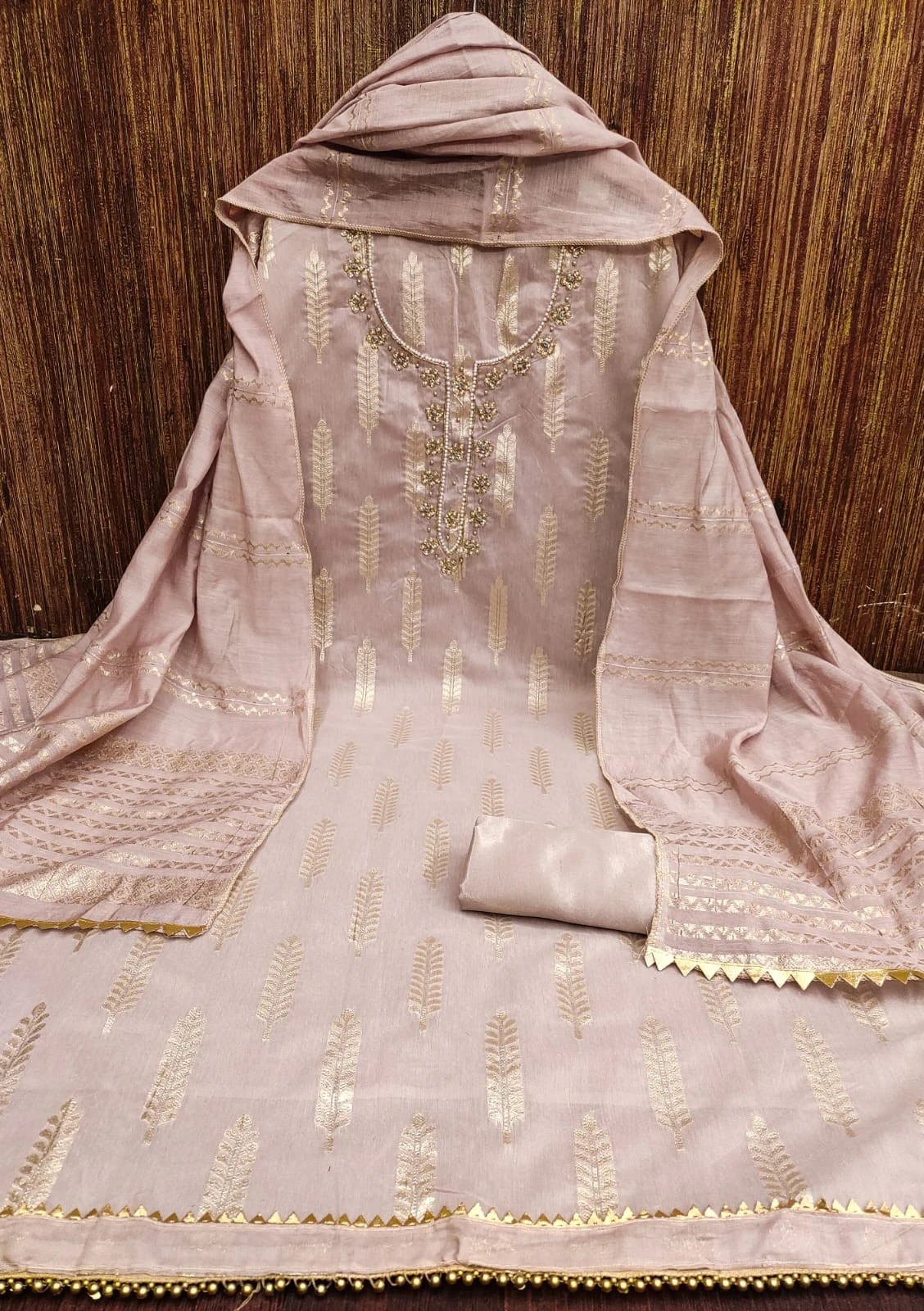 Elevate your ethnic wardrobe with our Banarasi Jacquard Dress Material in light brown, and make a statement at weddings, festivals, or special gatherings.