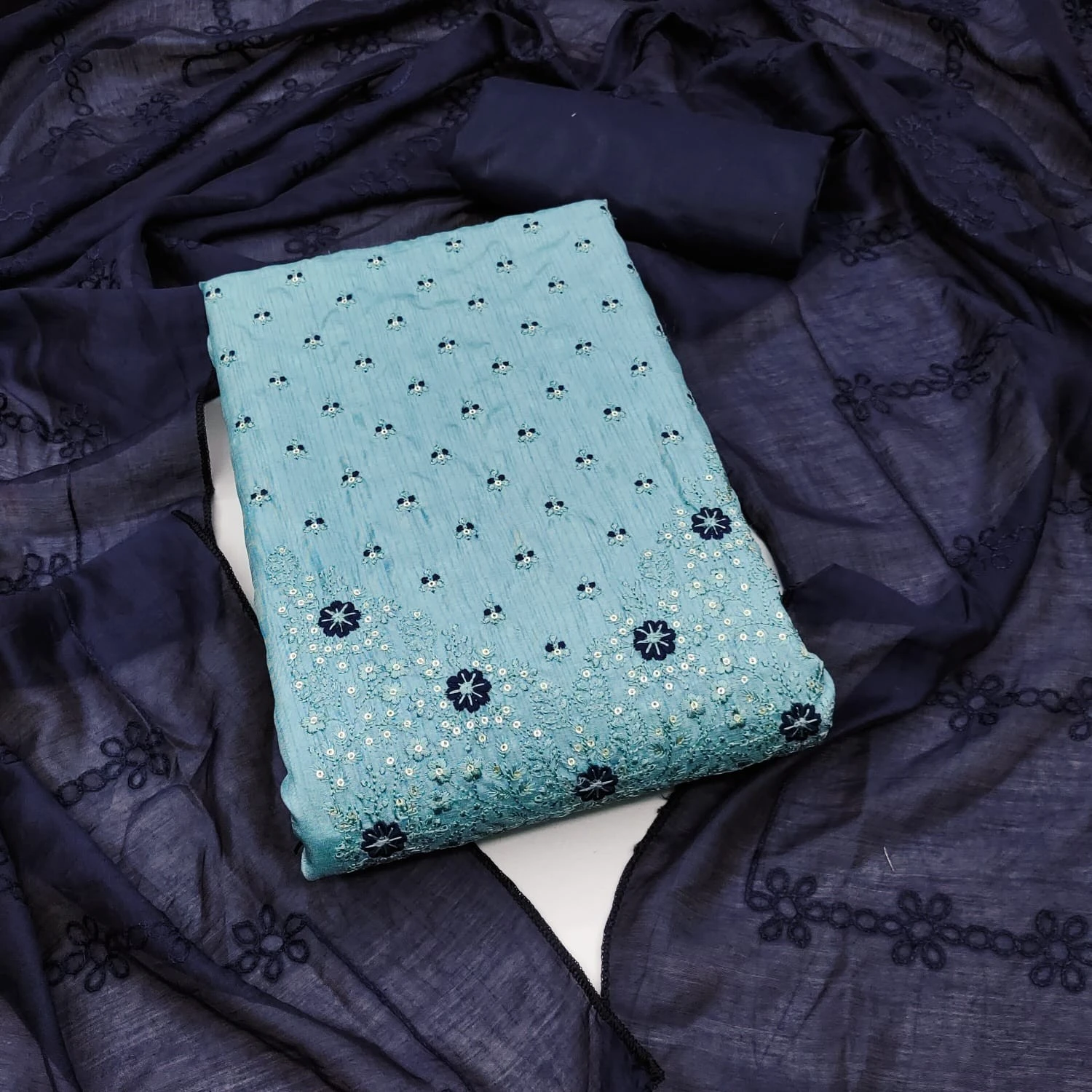 CHANDERI SILK BLUE DRESS MATERIAL WITH EMBROIDERY WORK