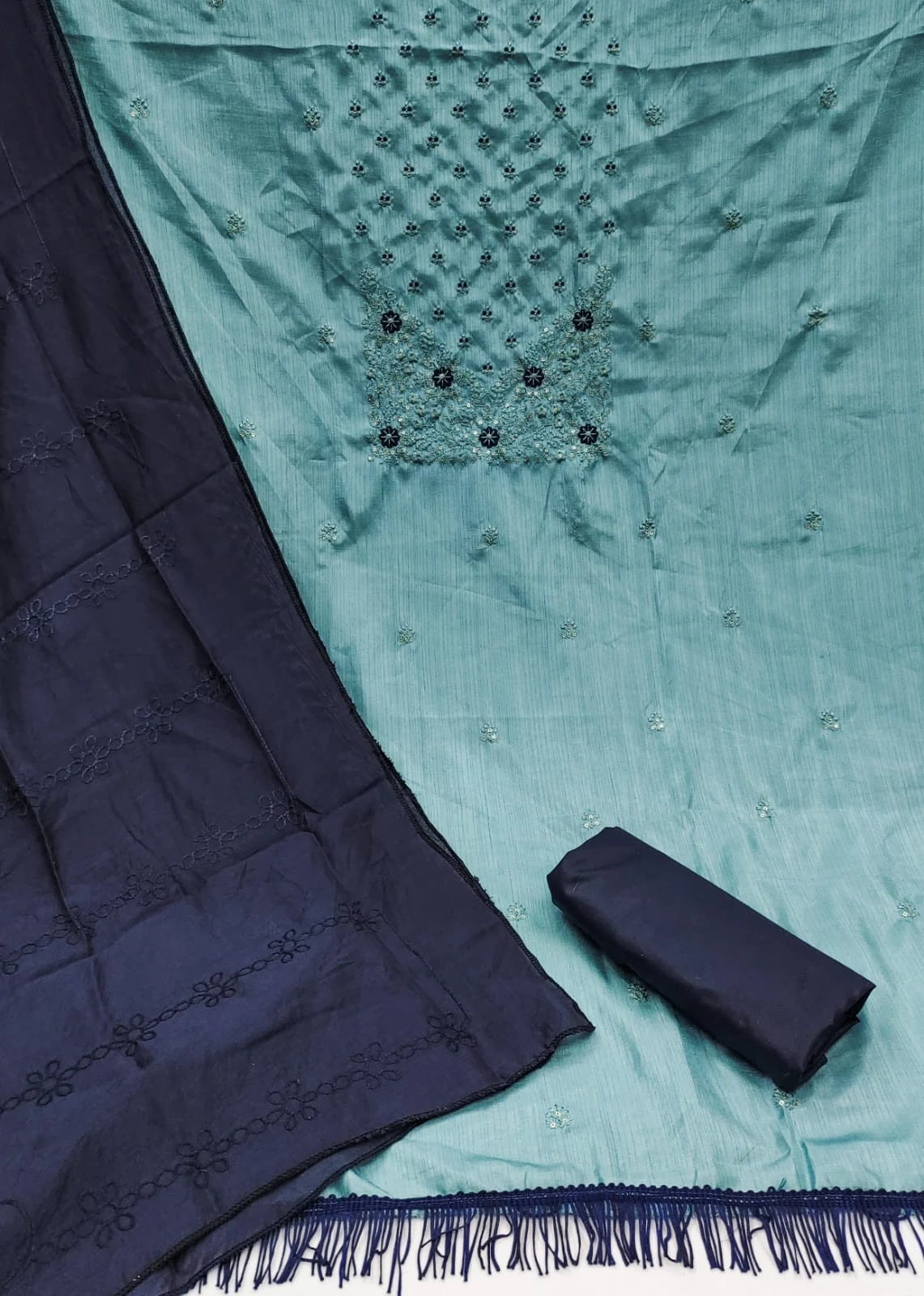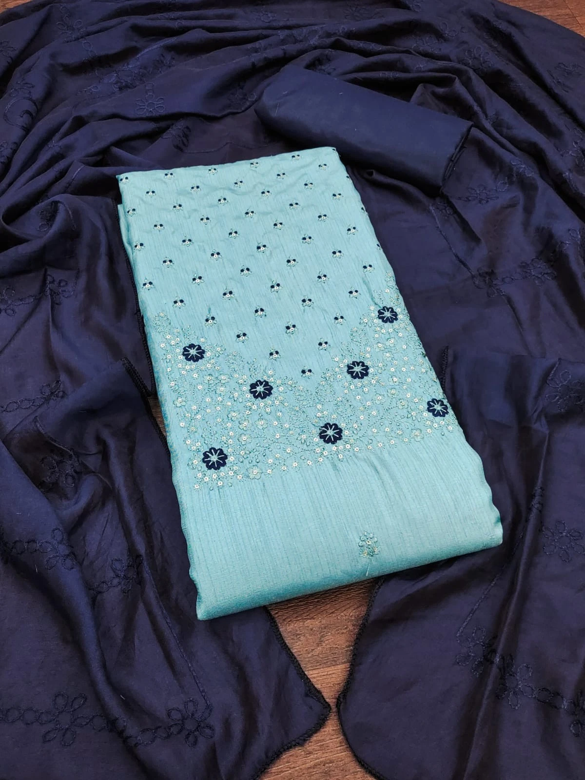 Introducing our stunning Chanderi Silk Blue Dress Material with exquisite embroidery work, perfect for adding a touch of elegance and sophistication to your ethnic wardrobe.