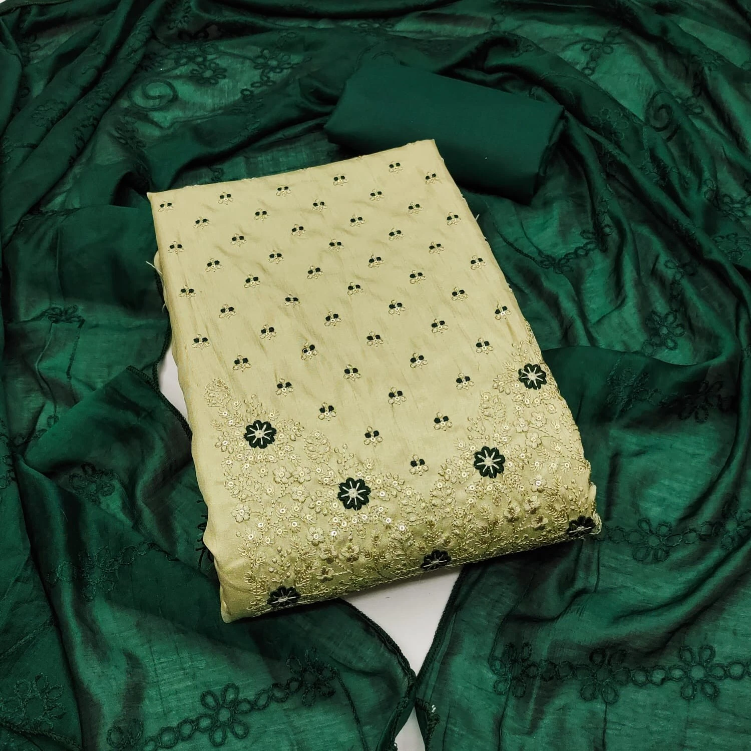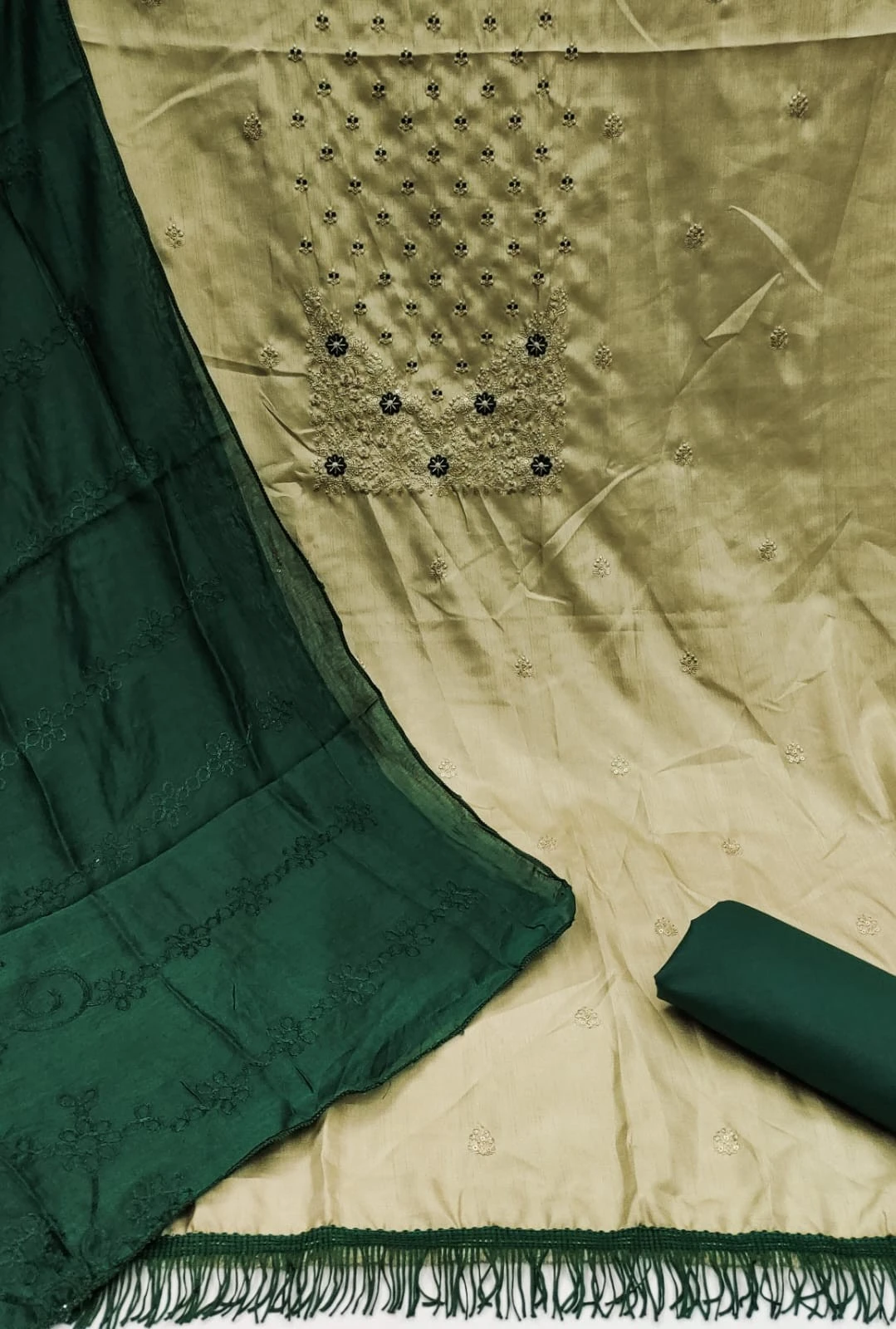 Introducing our exquisite Chanderi Silk Green Dress MATERIAL, featuring intricate embroidery work that adds a touch of elegance and charm to your ethnic ensemble.