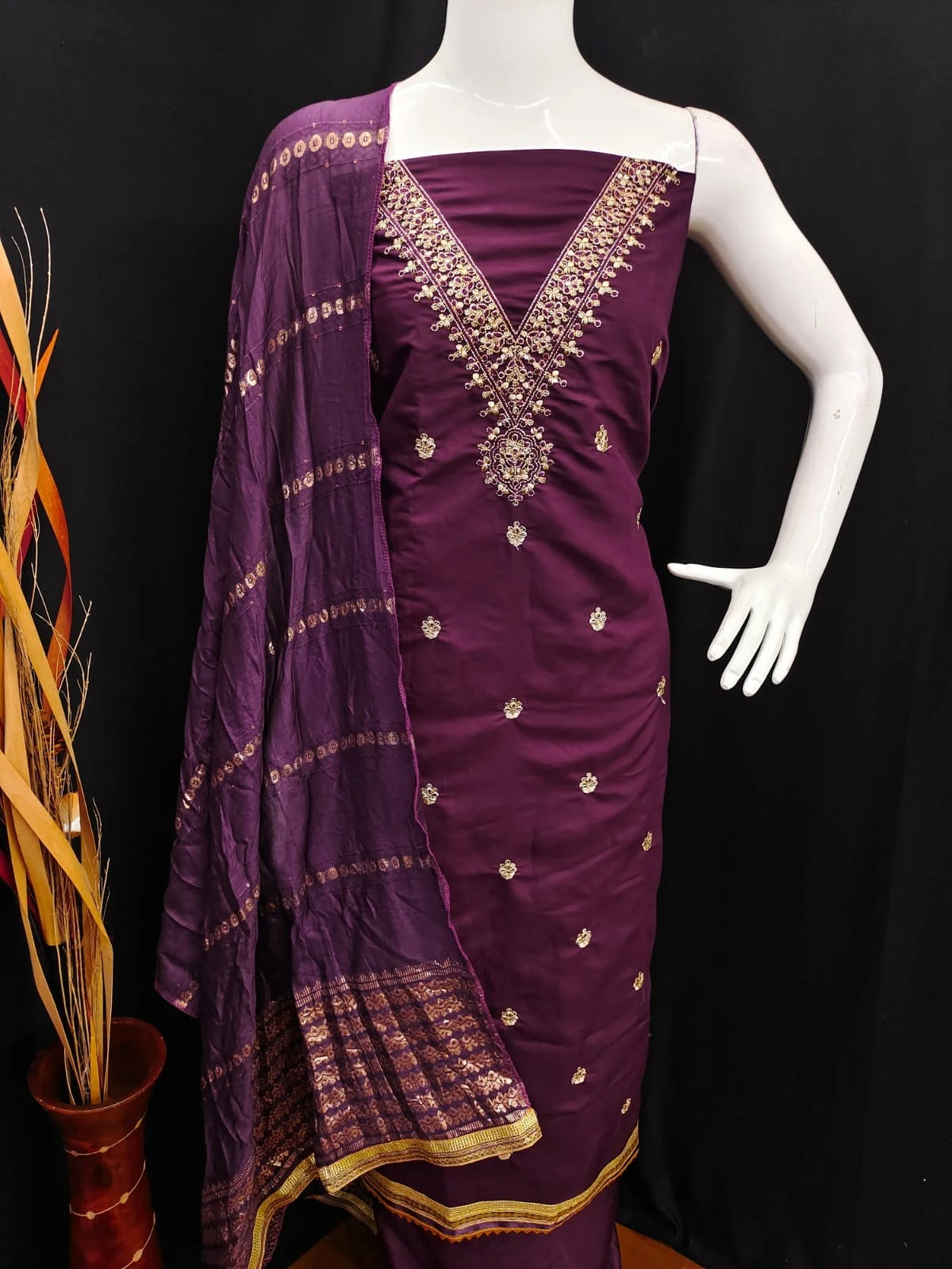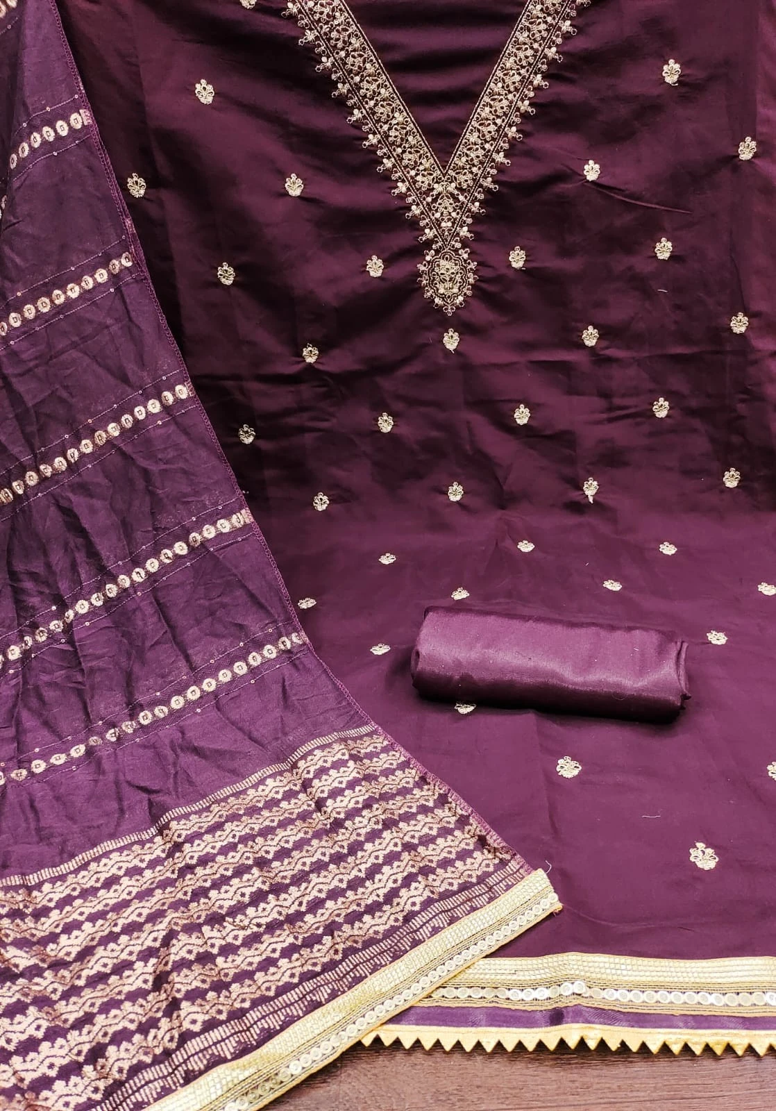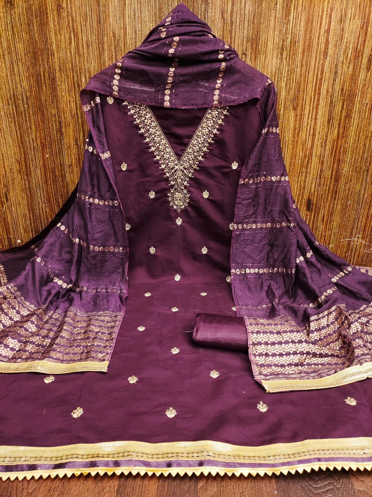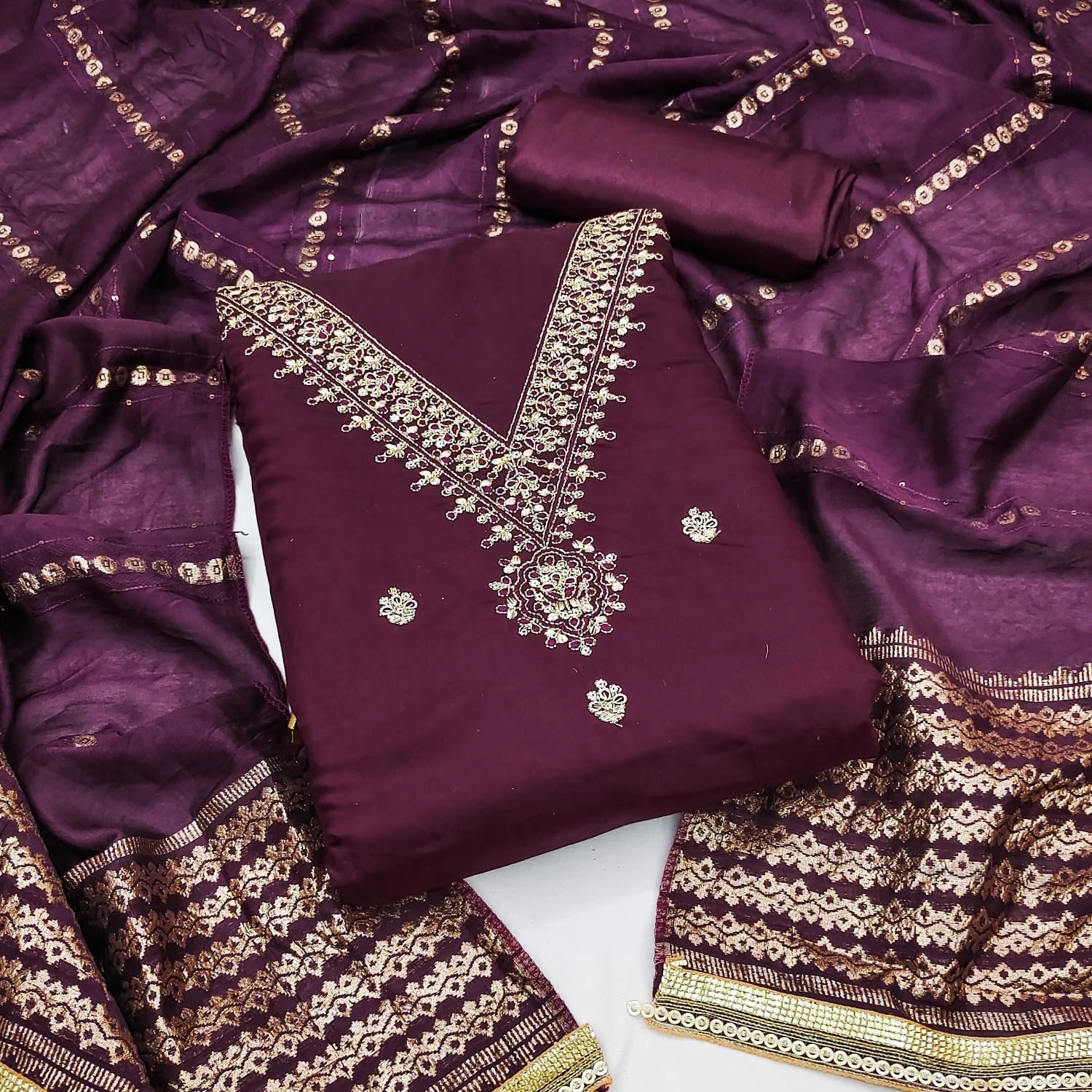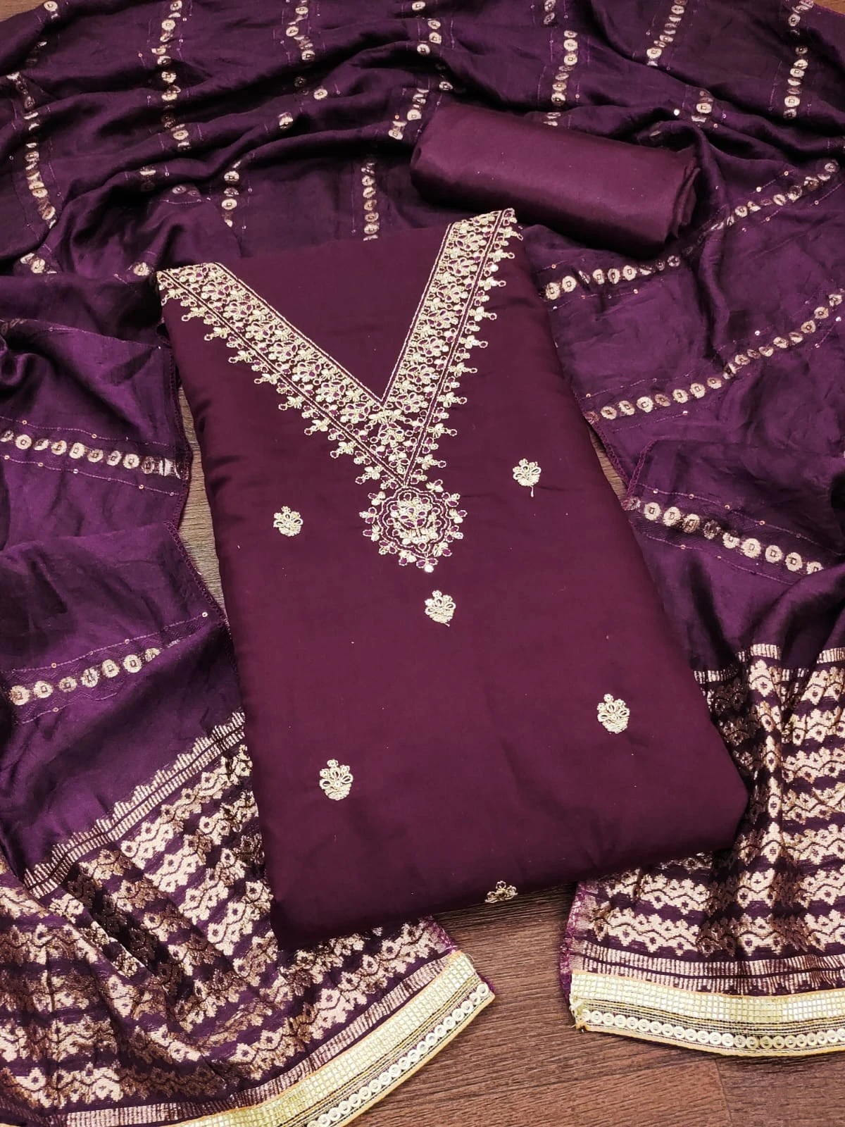 Elevate your ethnic style with our Chanderi Silk with Embroidery Dress Material in purple, and make a statement at weddings, parties, or any special event.