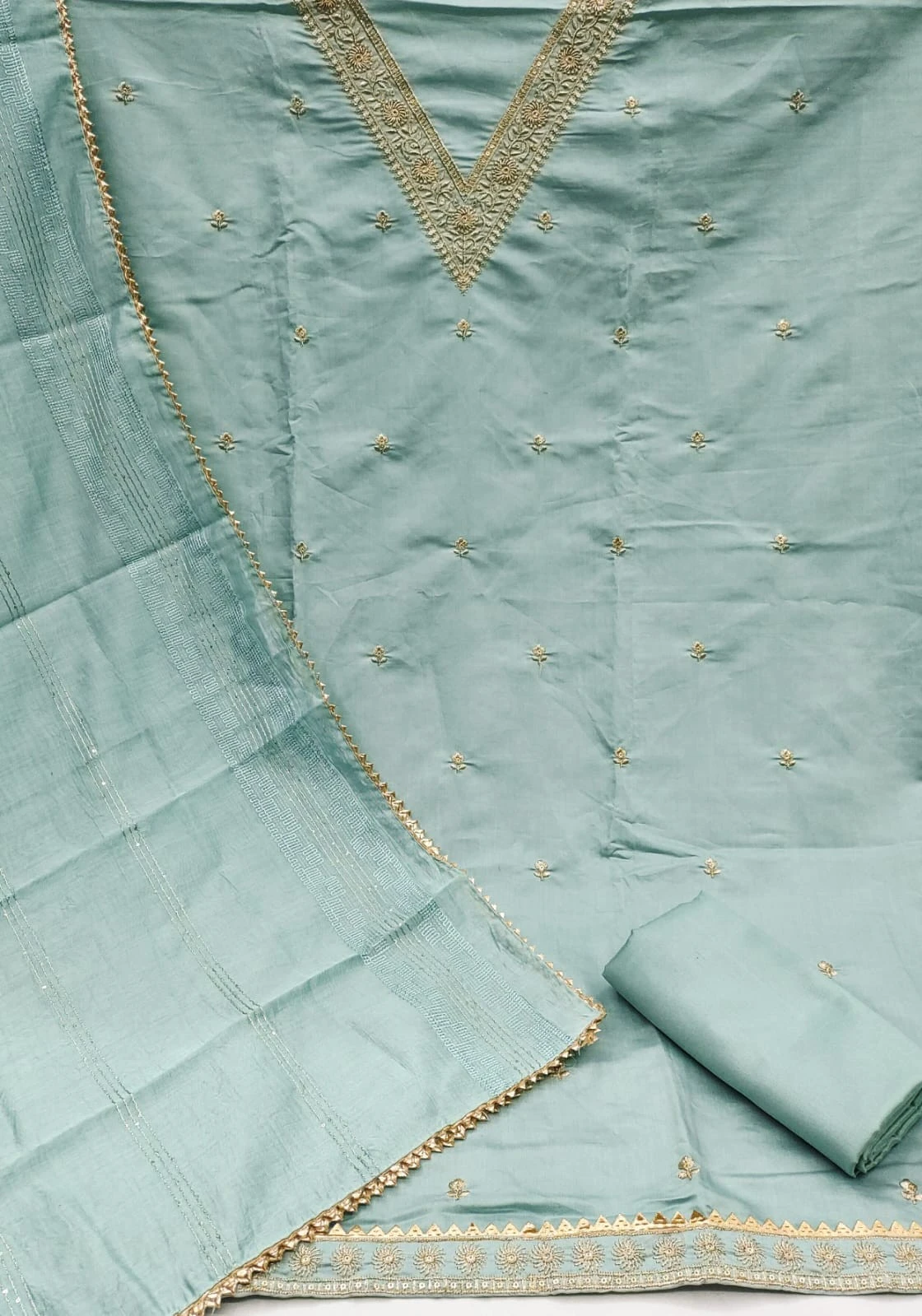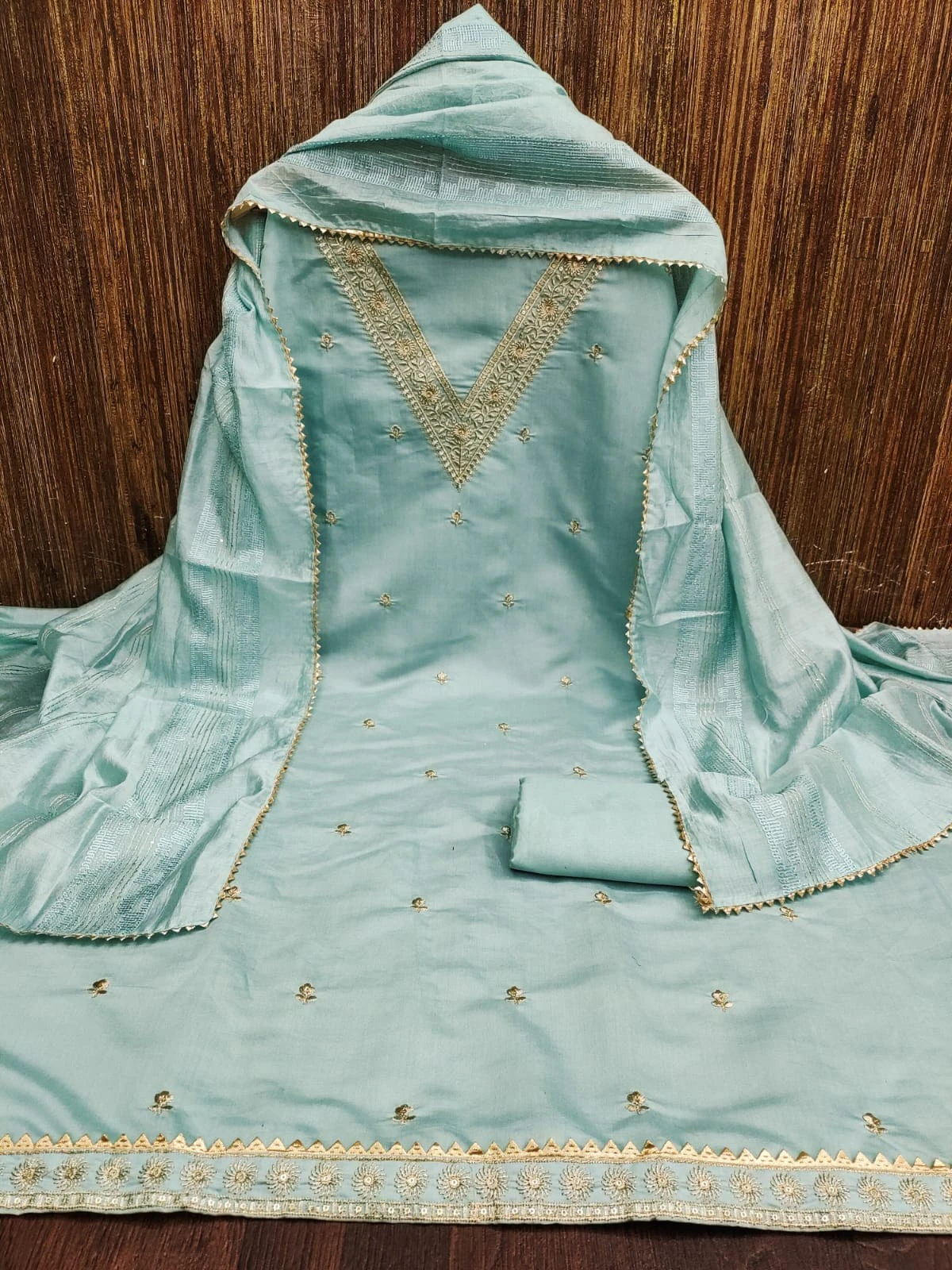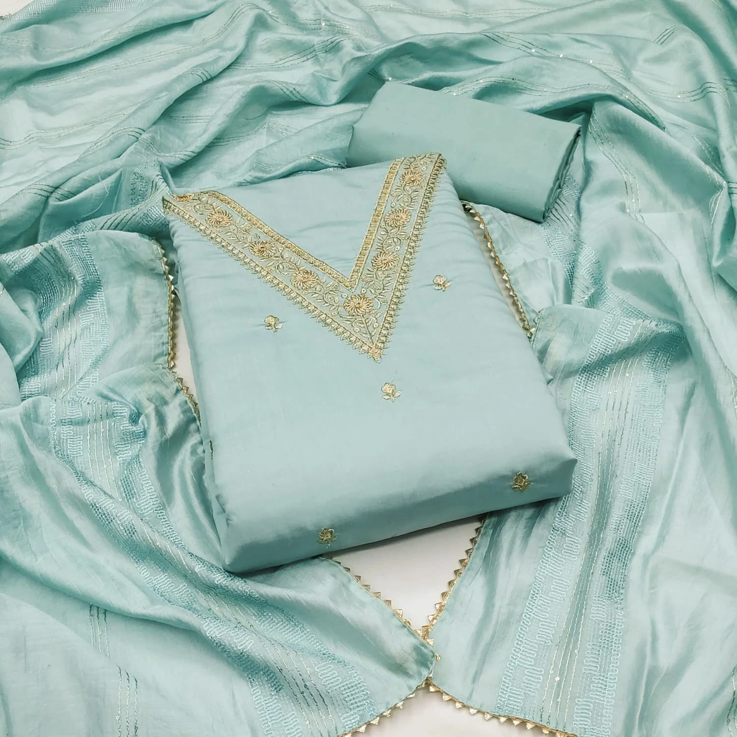 Introducing our exquisite Chanderi Silk Dress Material in a serene sky blue shade, designed to enhance your ethnic wardrobe with its timeless elegance and intricate detailing.