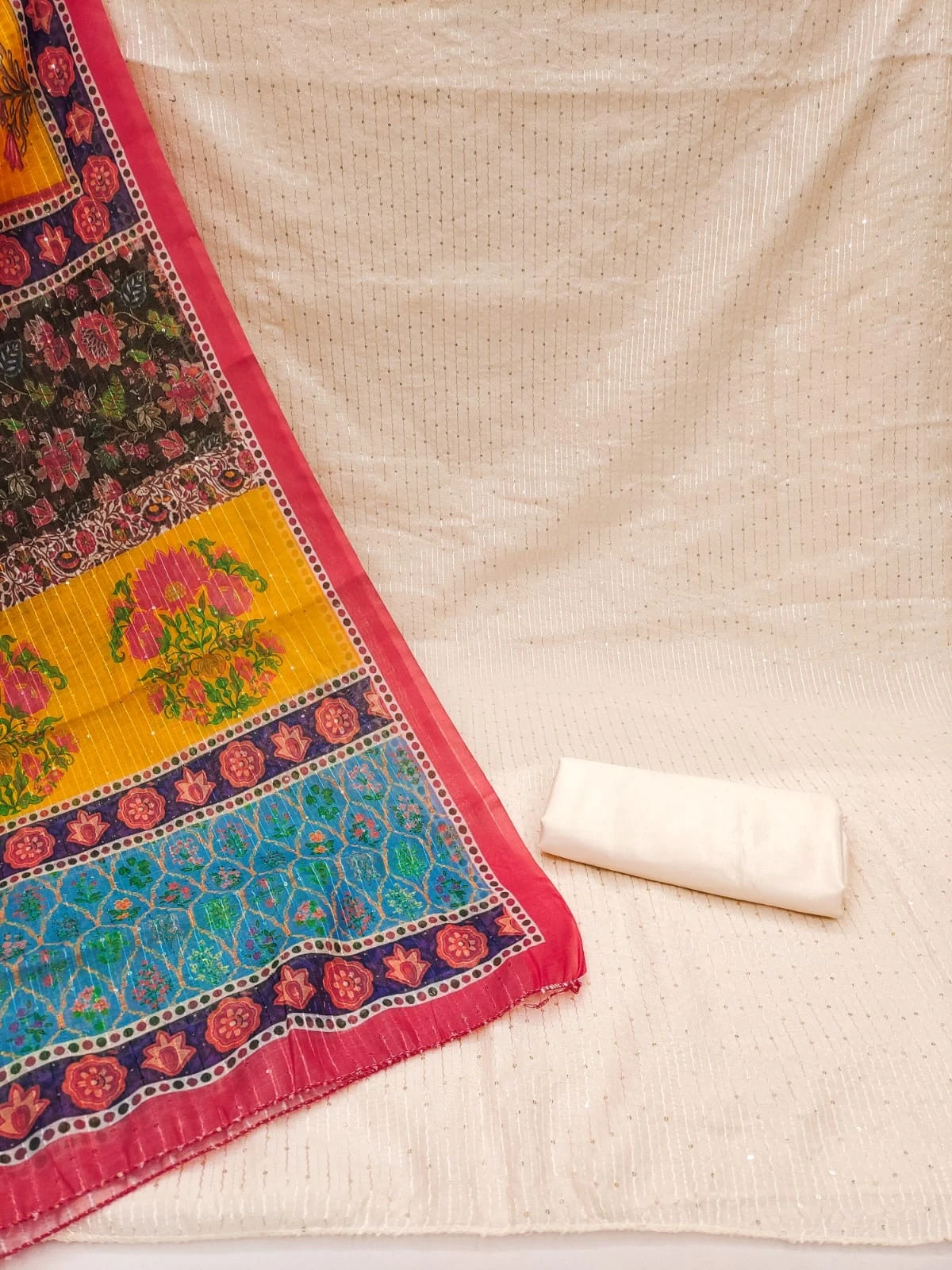 2. Top Fabric (2.1 meters): Crafted from high-quality Chanderi silk, the top features exquisite sequence work, adding a touch of shimmer and sophistication to your attire.