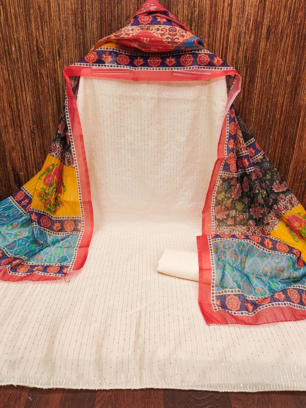 Indulge in the charm of traditional craftsmanship with our Embroidered Unstitched White and Yellow Dress Material. Here's why it's the perfect choice for your ethnic wardrobe: