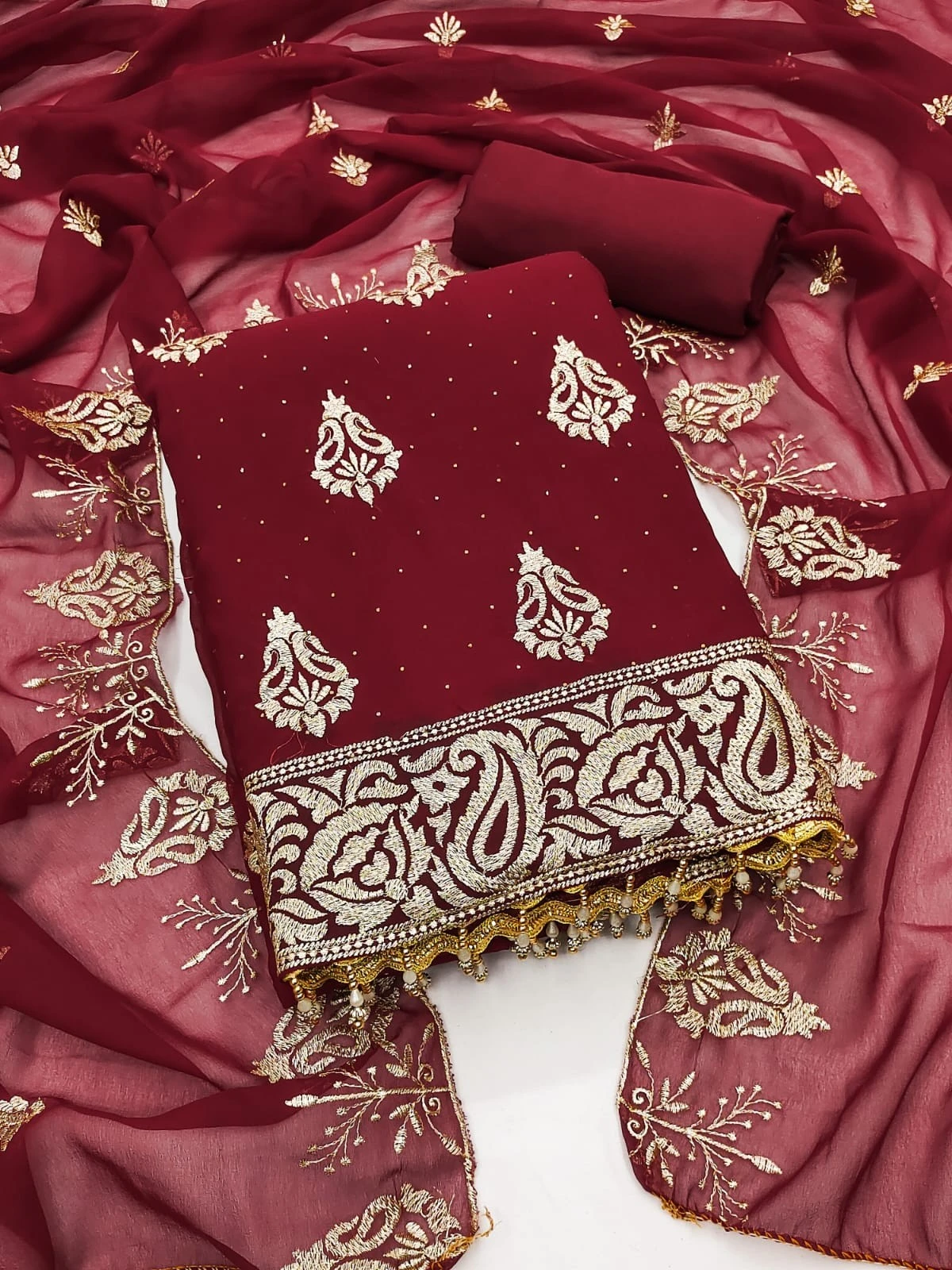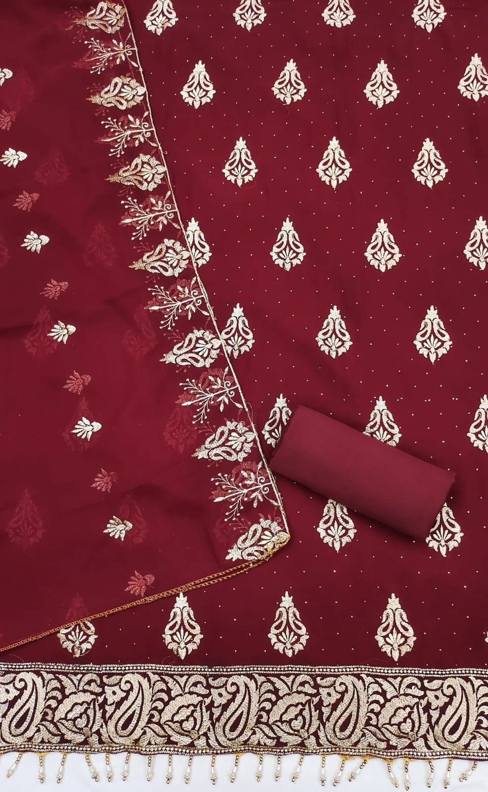 EMBROIDERY AND DIAMOND WORK Maroon CREPE Dress Material