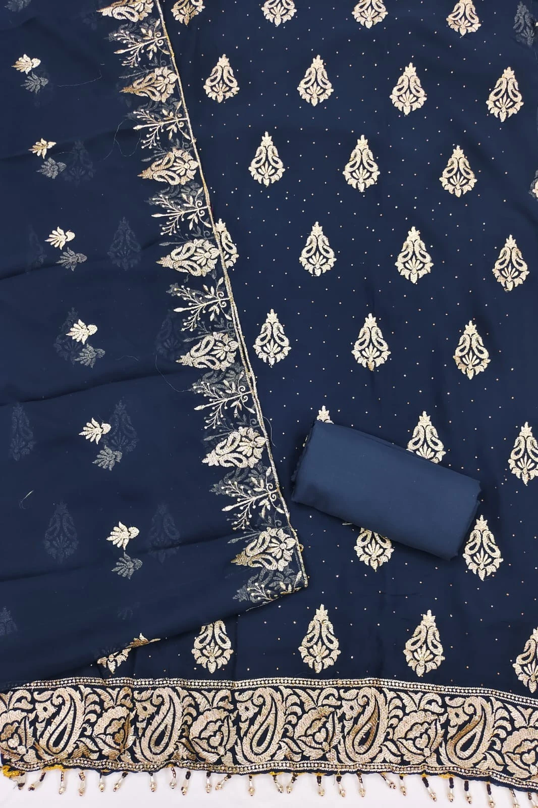 EMBROIDERY AND DIAMOND WORK Navy CREPE Dress Material