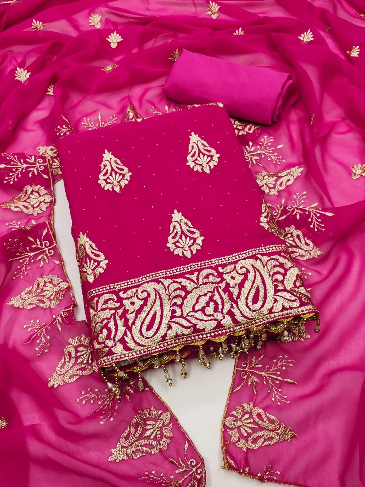1. Top Fabric (2.1 meters): Crafted from high-quality georgette, the top is adorned with intricate diamond work, adding a touch of sparkle and glamour to your attire.
