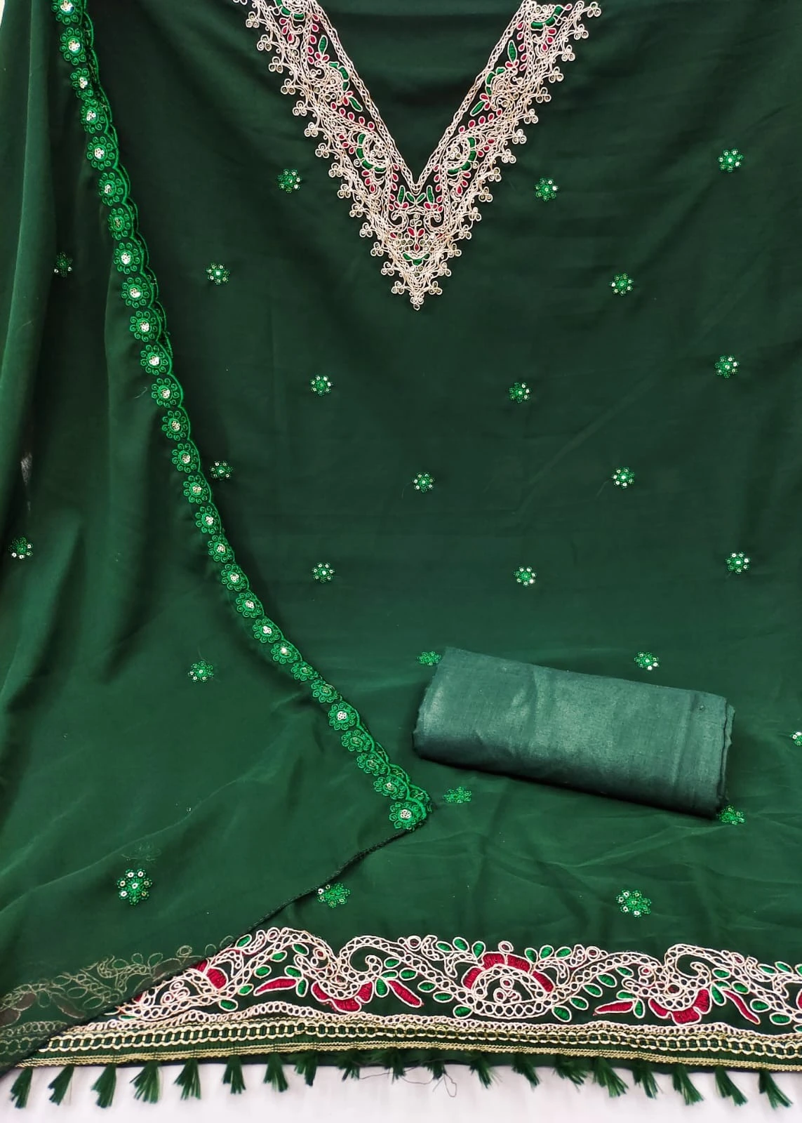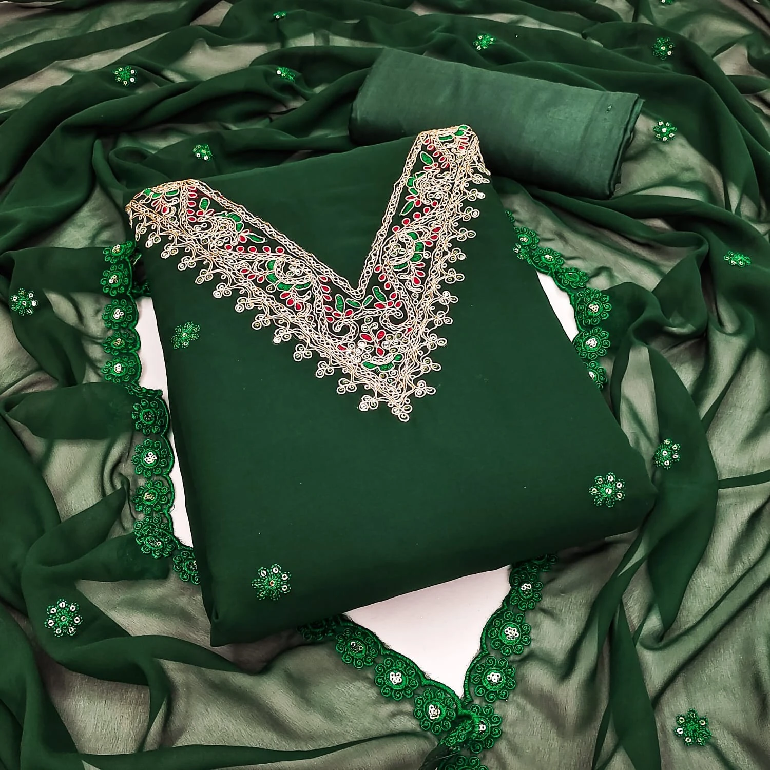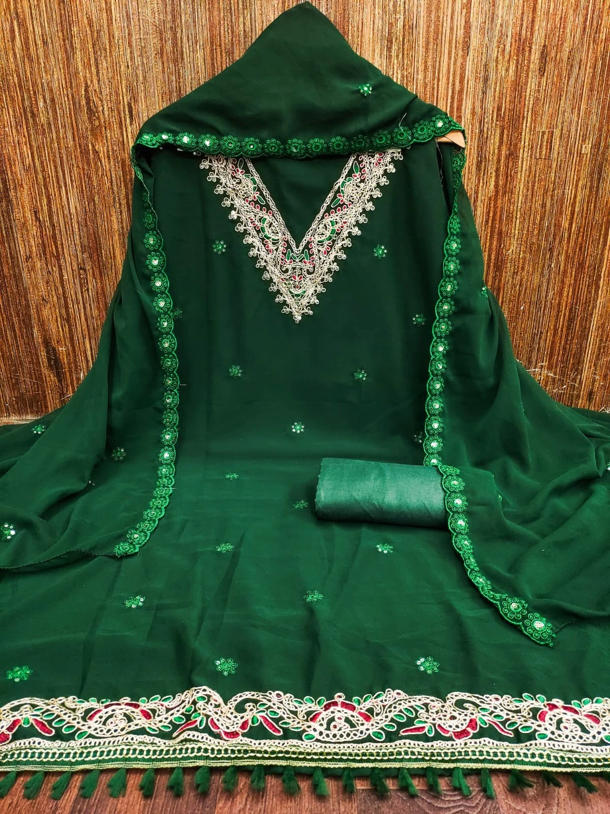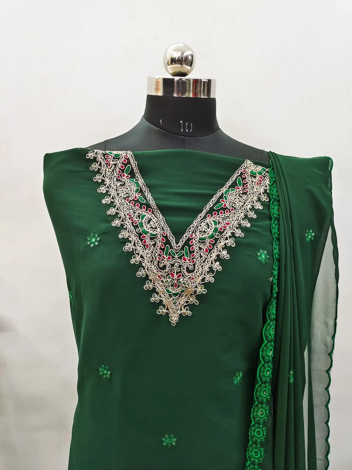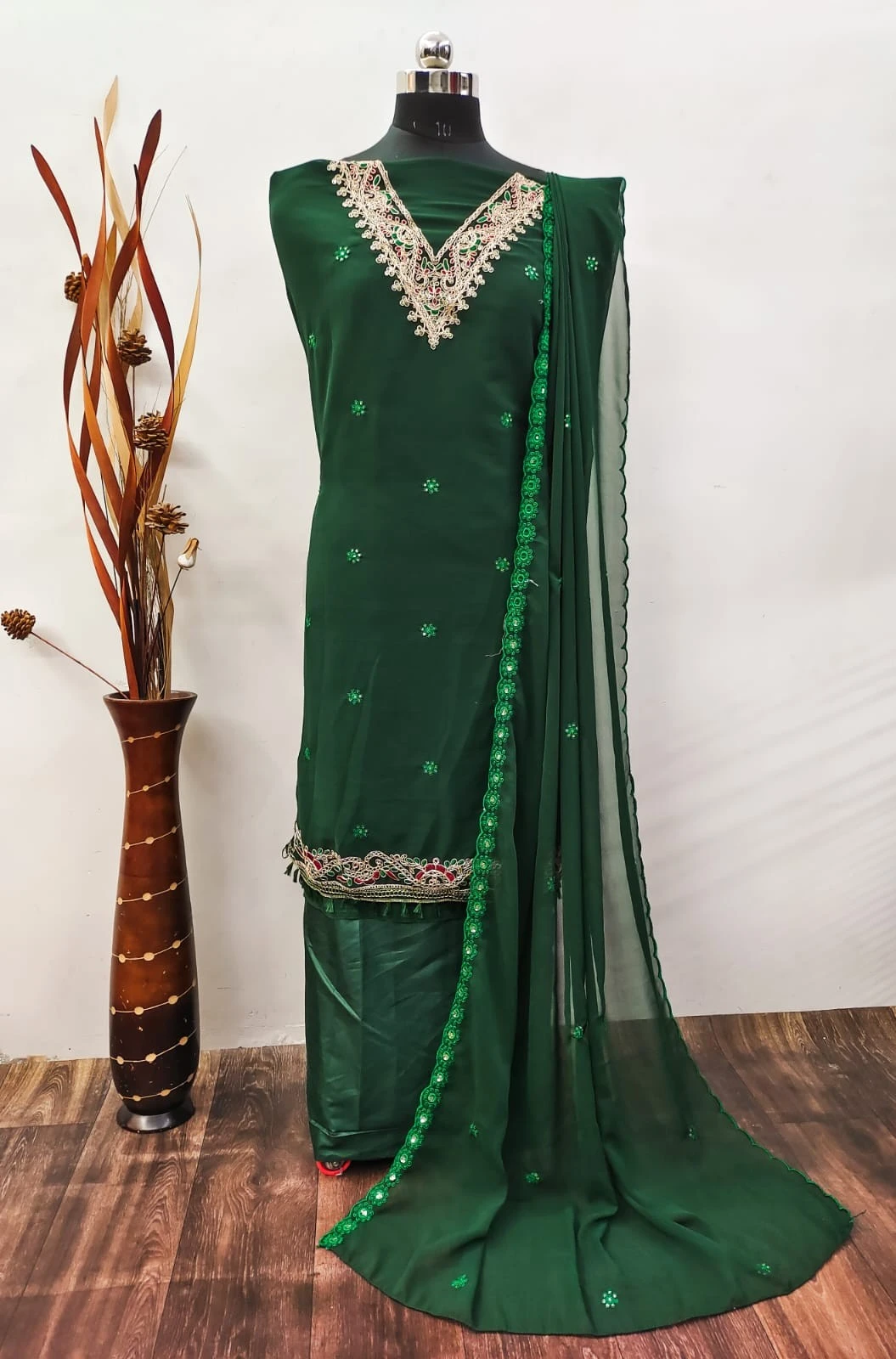 Step out in style and grace with our Green Georgette Dress Material, perfect for various festive occasions and celebrations.