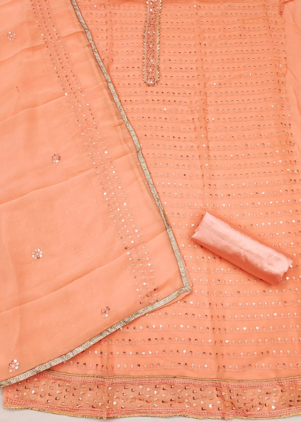 Color: The dress material is available in a serene Ice Cream Baby Orange shade, symbolizing freshness, tranquility, and nature. This soft and soothing hue is perfect for creating a chic and sophisticated look, whether for daytime events or evening gatherings.
