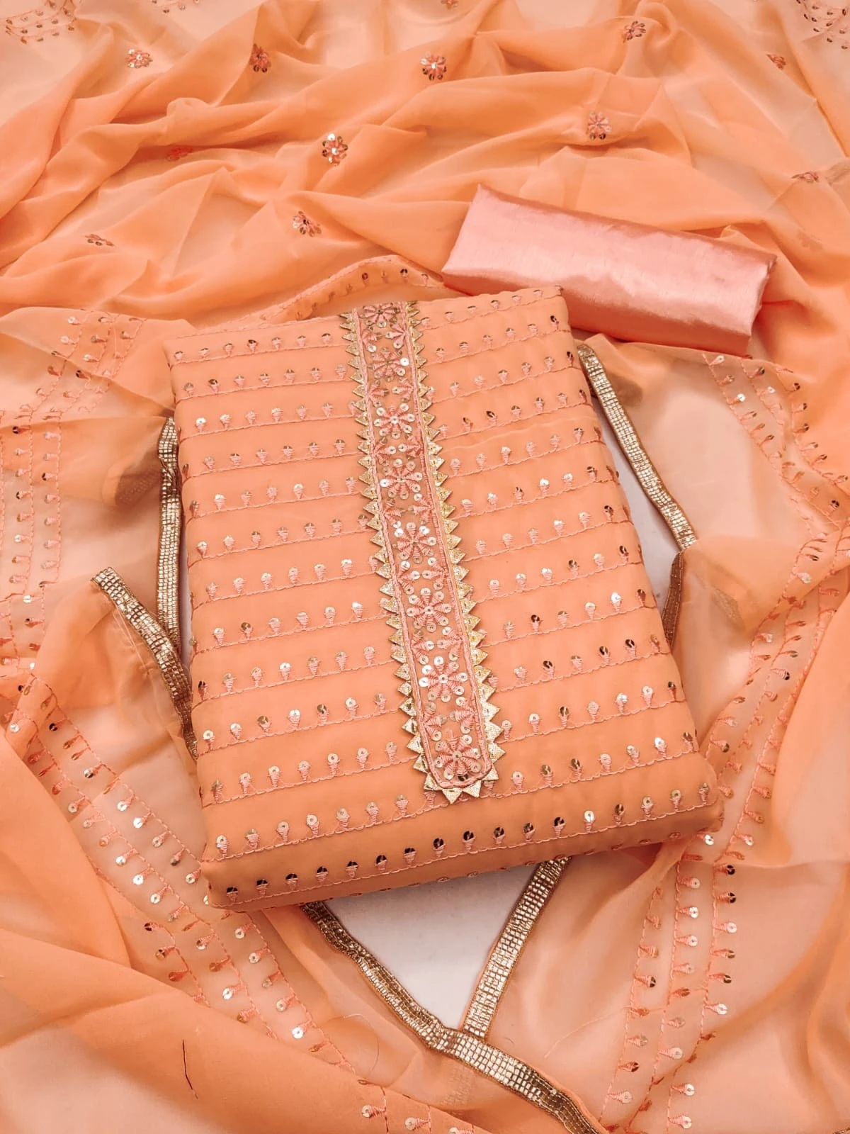 Make a style statement with our Ice Cream Baby Orange Georgette Dress Material, featuring intricate embroidery and sequin work for a touch of luxury and charm.