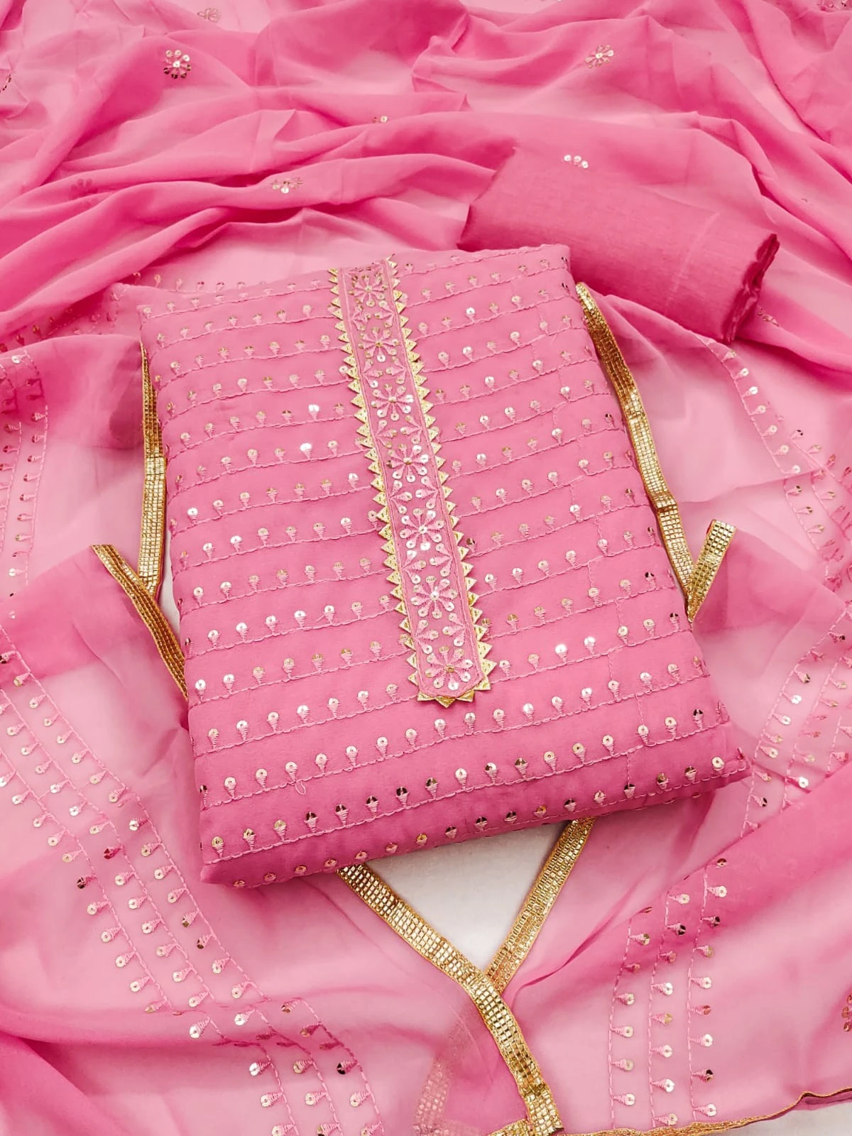 Elevate your style quotient with our Ice Cream Baby Pink Georgette Dress Material, featuring intricate embroidery and sequin work for a glamorous touch.
