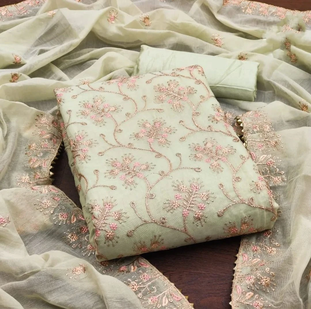 Top: The top is made from luxurious Chanderi silk adorned with intricate Zari embroidery work, adding a touch of opulence and sophistication. With 2.1 meters of fabric, the top offers ample room for customization to suit your style preferences.