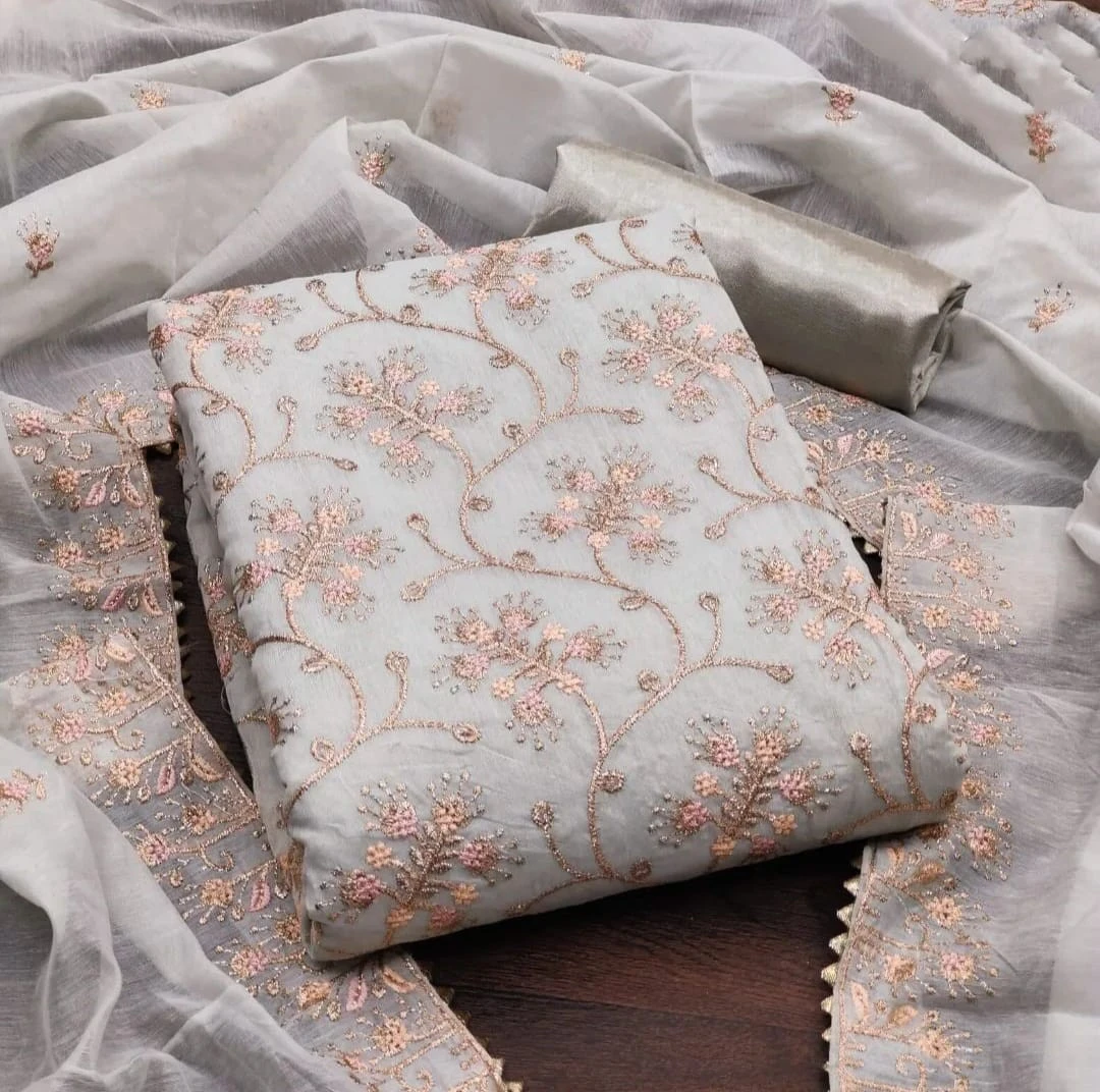 KASHMIR KI KALI GREY CHANDERI SILK DRESS MATERIAL