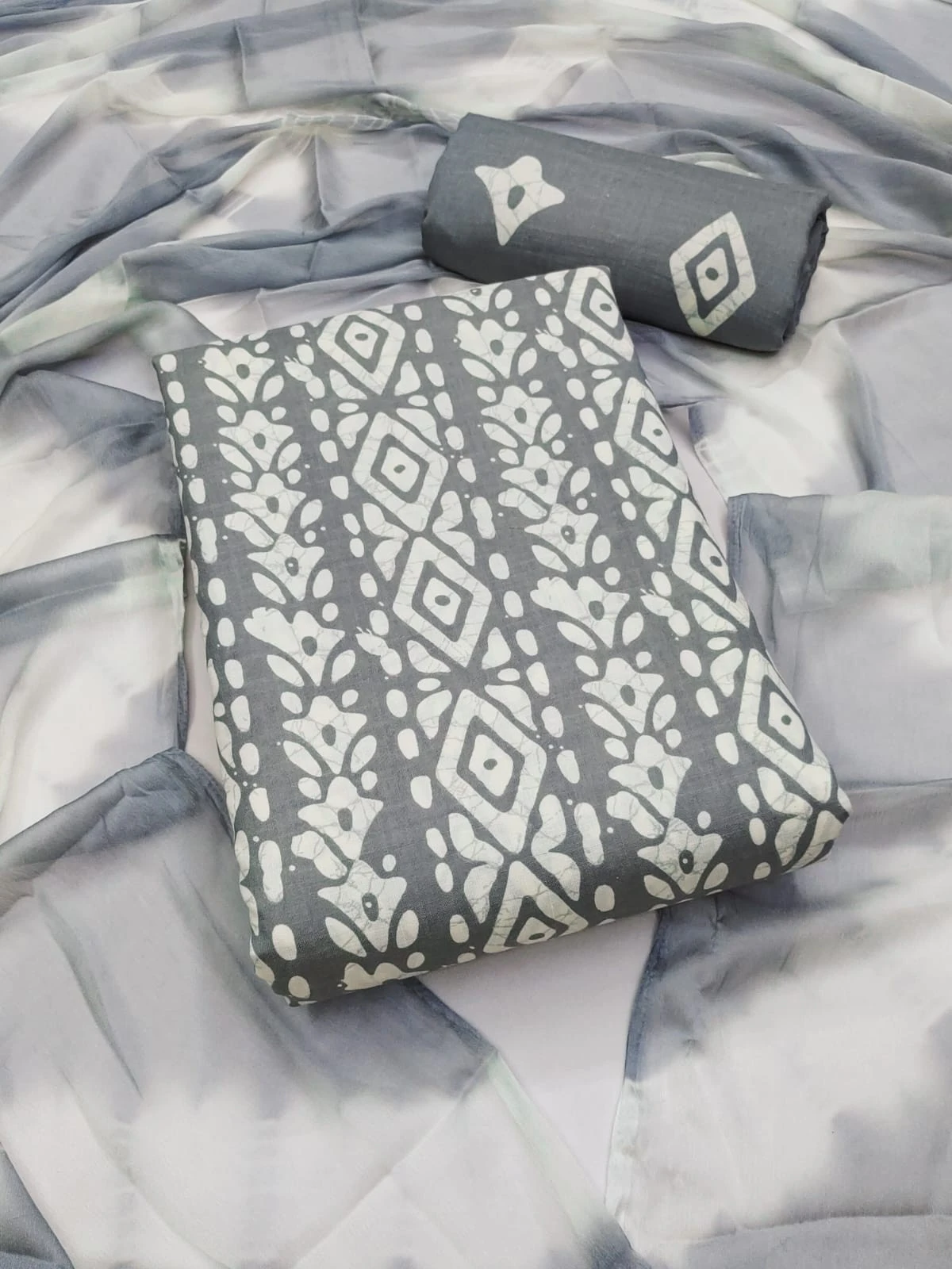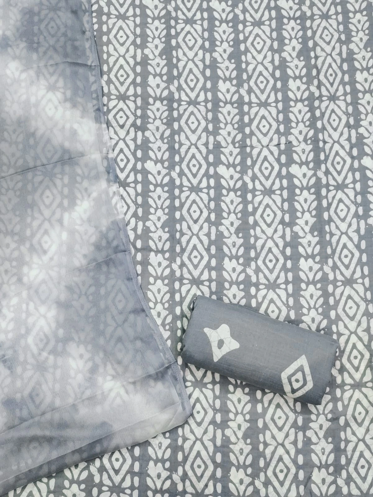 Elevate your ethnic style with our Women's Batik Slub Cotton Dress Material in grey, featuring intricate prints and comfortable fabric.
