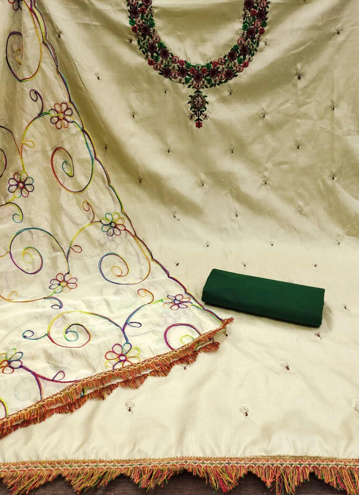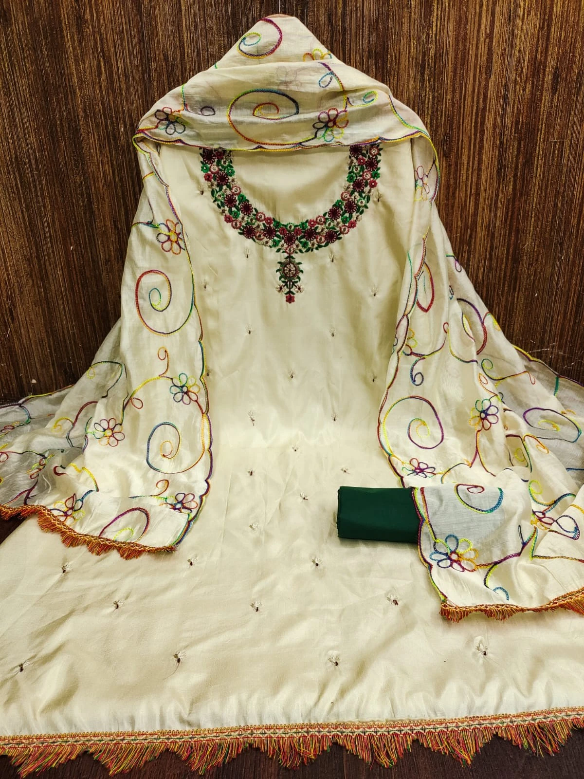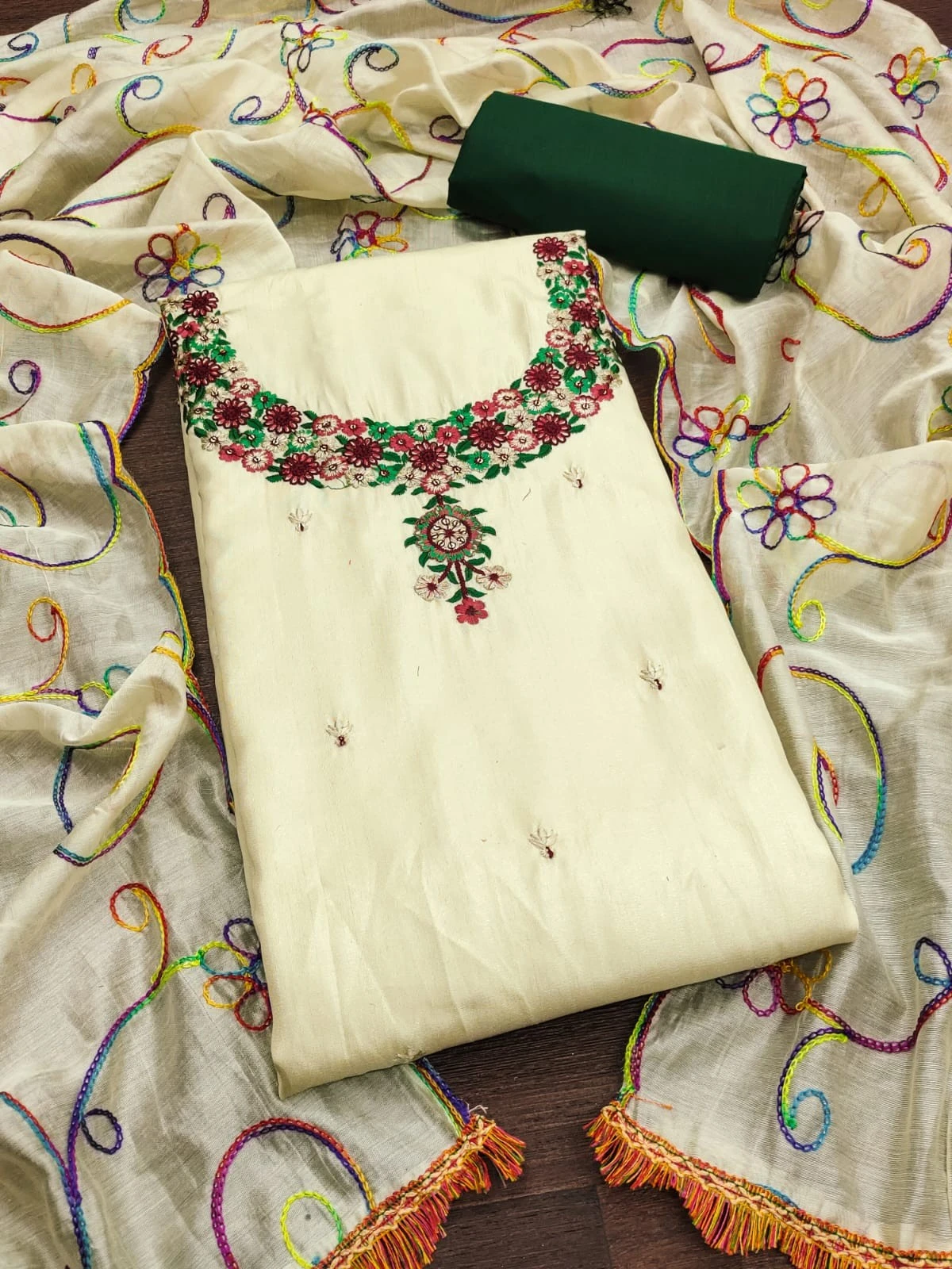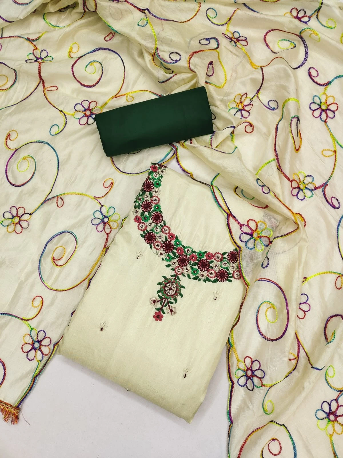 Introducing our exquisite Women Embroidery Chanderi Silks Green Dress Material, a perfect blend of elegance and sophistication. Crafted with precision and care, this ensemble is designed to elevate your ethnic wardrobe and add a touch of timeless charm to your look.