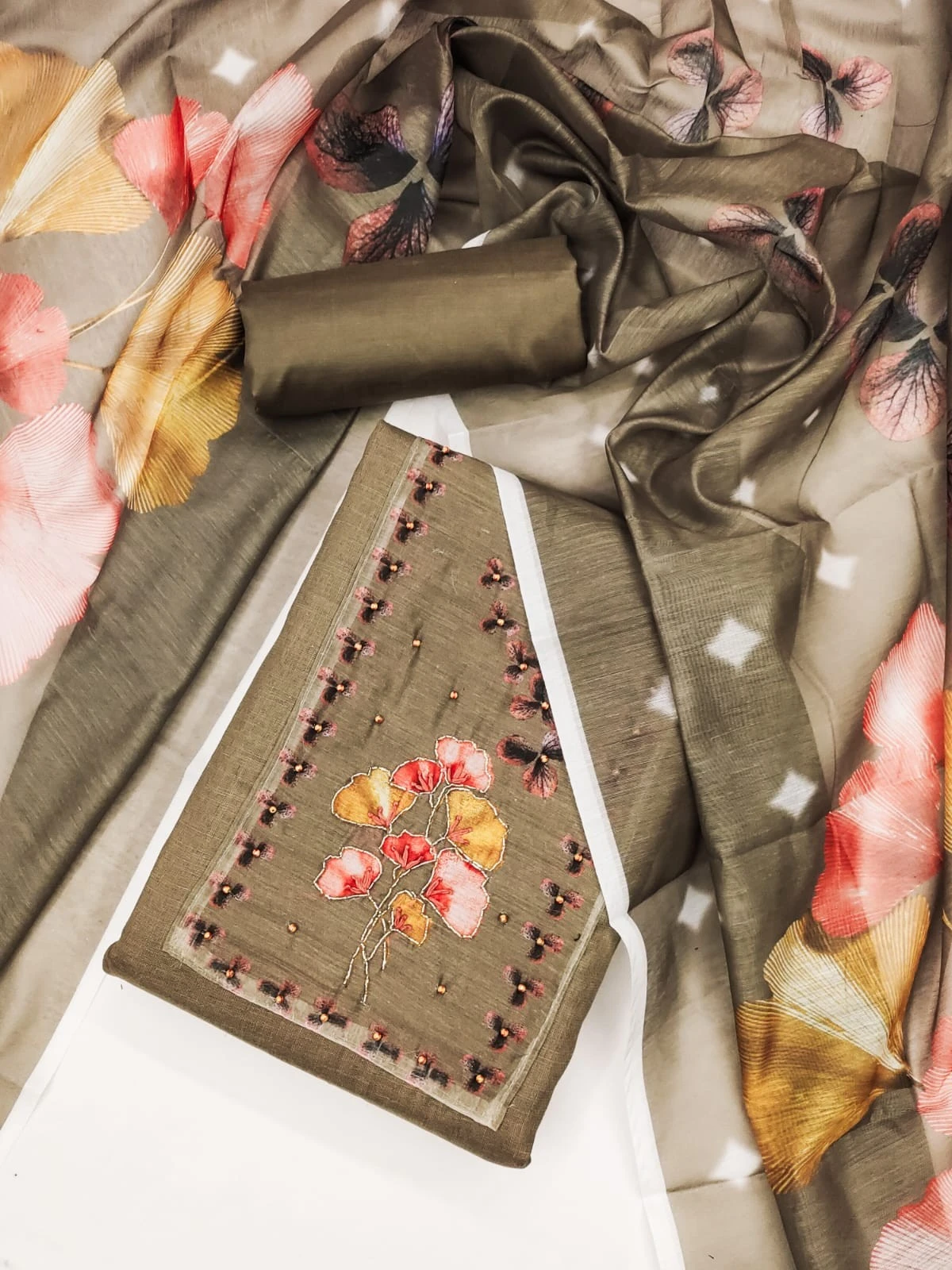 Introducing our exquisite Women Floral Brown Slub Cotton Dress Material, a perfect blend of traditional craftsmanship and contemporary design. This ensemble is meticulously crafted to add elegance and grace to your ethnic wardrobe.