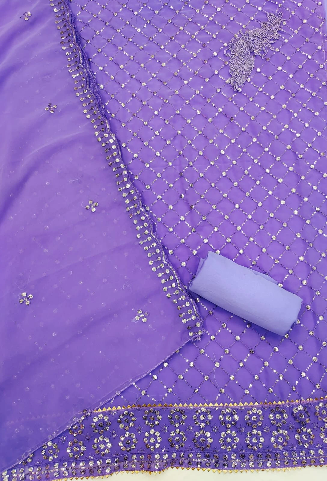 Dupatta: Complete your ensemble with the matching georgette dupatta featuring intricate sequence and embroidered work. The dupatta adds an extra layer of sophistication and style, elevating your look and making a statement wherever you go.