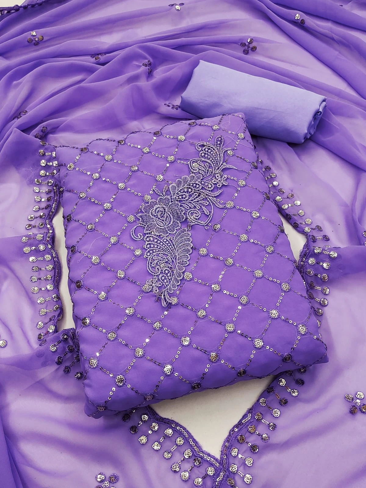 Color: Embrace the timeless allure of violet with our Georgette Sequence Butti Violet Dress Material. Brown is a versatile and classic color choice that exudes warmth and elegance, making it perfect for various occasions and settings.