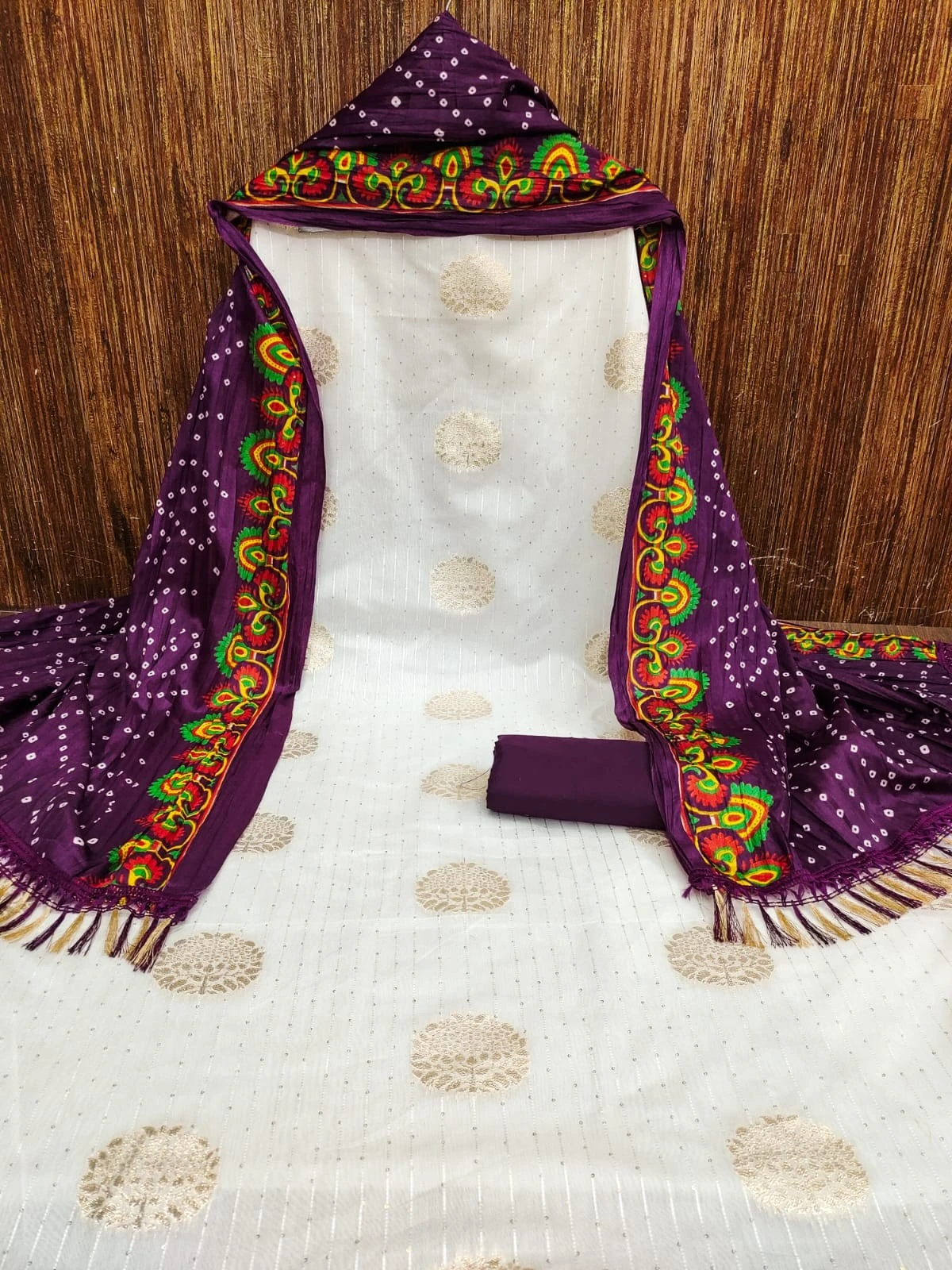 Introducing our exquisite Women Jacquard Silk White & Purple Dress Material, a blend of elegance and sophistication that will elevate your ethnic wardrobe to new heights. Crafted with precision and attention to detail, this ensemble exudes timeless charm and refined style.