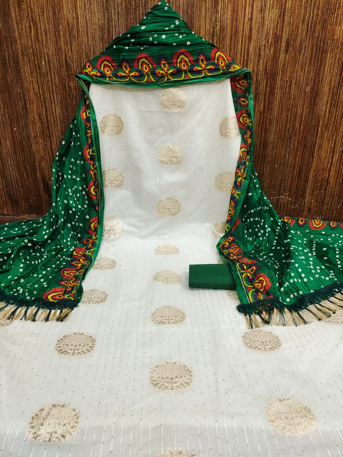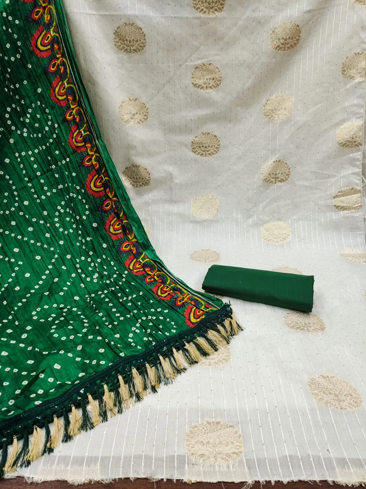 Introducing our exquisite Women Jacquard Silk White & Dark Green Dress Material, a blend of elegance and sophistication that will elevate your ethnic wardrobe to new heights. Crafted with precision and attention to detail, this ensemble exudes timeless charm and refined style.