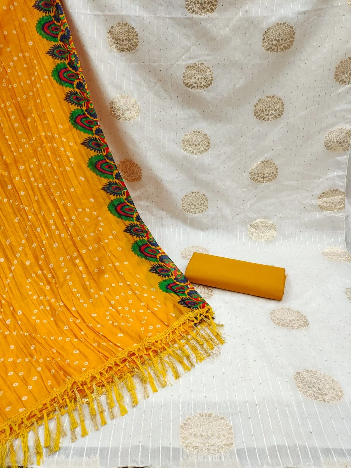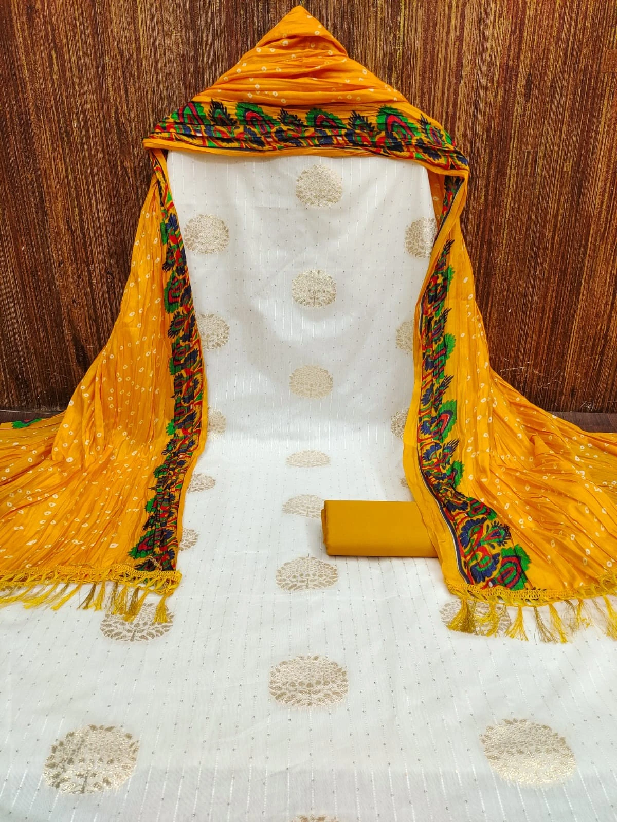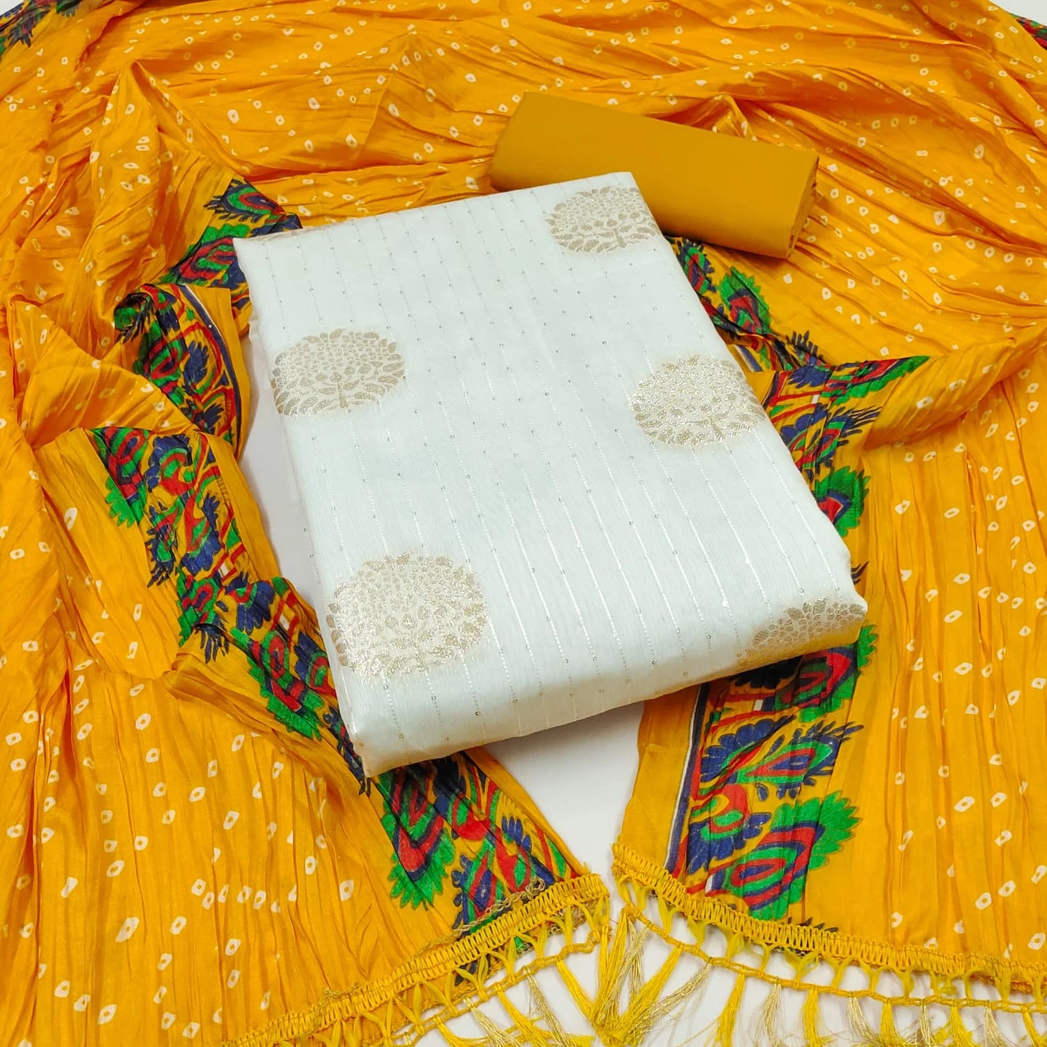 Introducing our exquisite Women Jacquard Silk White & Yellow Dress Material, a blend of elegance and sophistication that will elevate your ethnic wardrobe to new heights. Crafted with precision and attention to detail, this ensemble exudes timeless charm and refined style.
