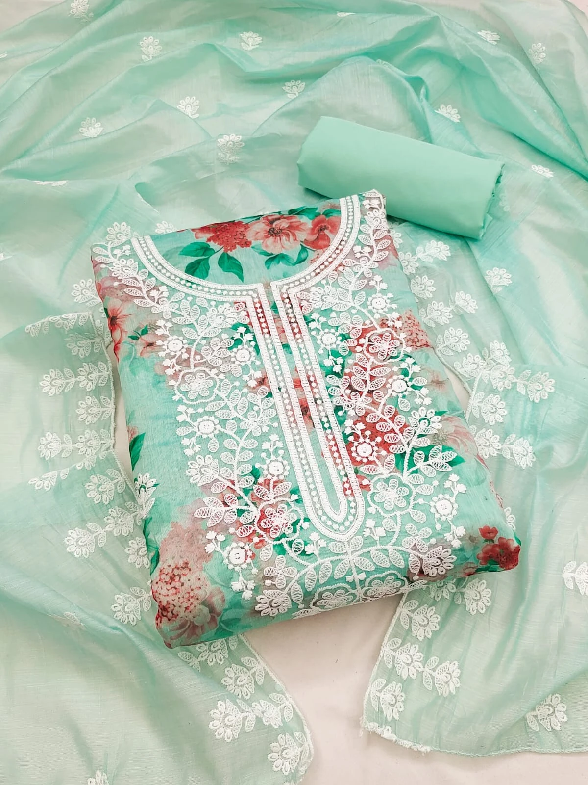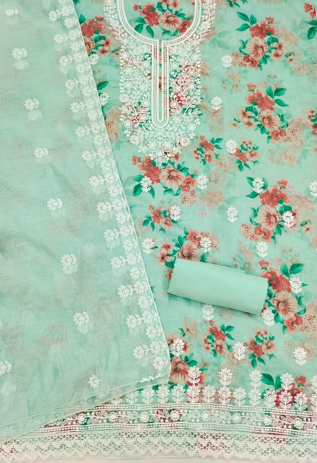 Color: Adorned in a vibrant Green hue, this dress material radiates freshness and vitality, making it perfect for various occasions and celebrations. The rich color adds a pop of brightness to your ensemble, ensuring you stand out with style.