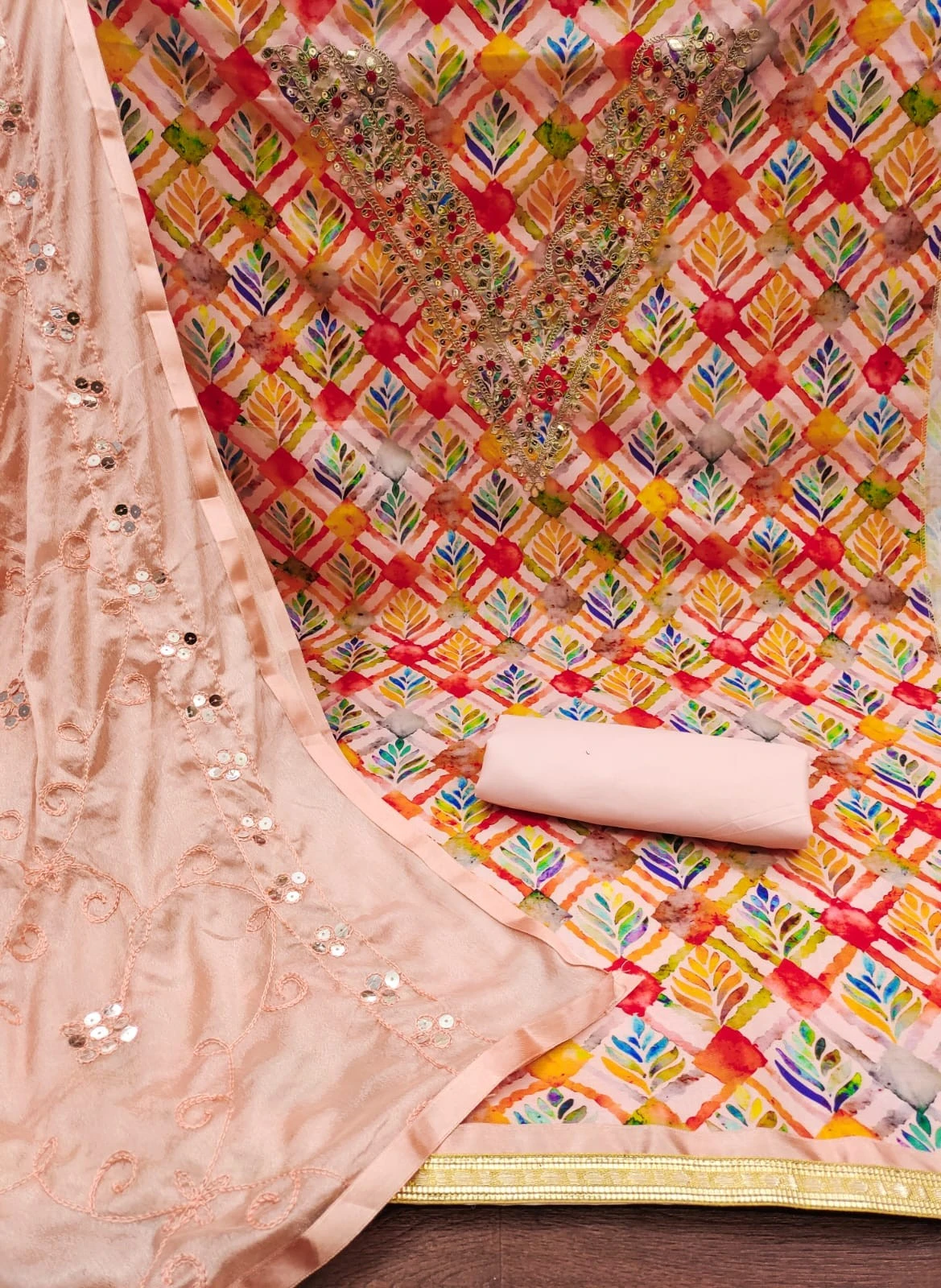 Color: The dress material comes in a soothing peach color, exuding femininity and grace. This versatile hue adds a subtle elegance to your ensemble, making it suitable for various occasions, from festive gatherings to formal events.