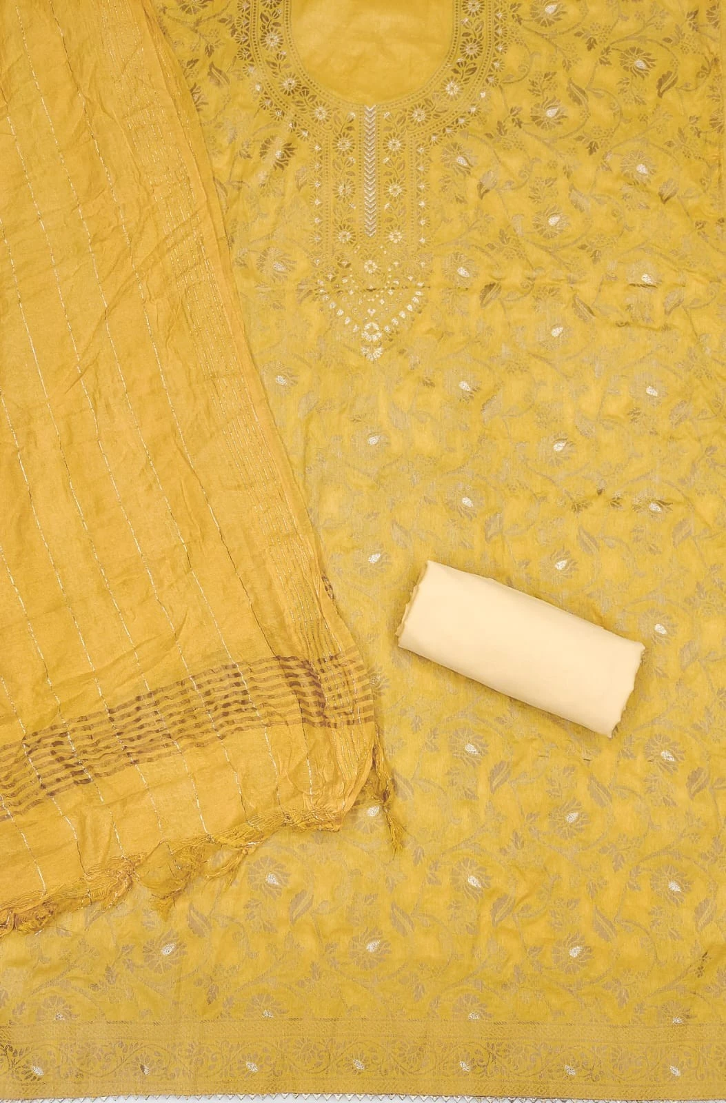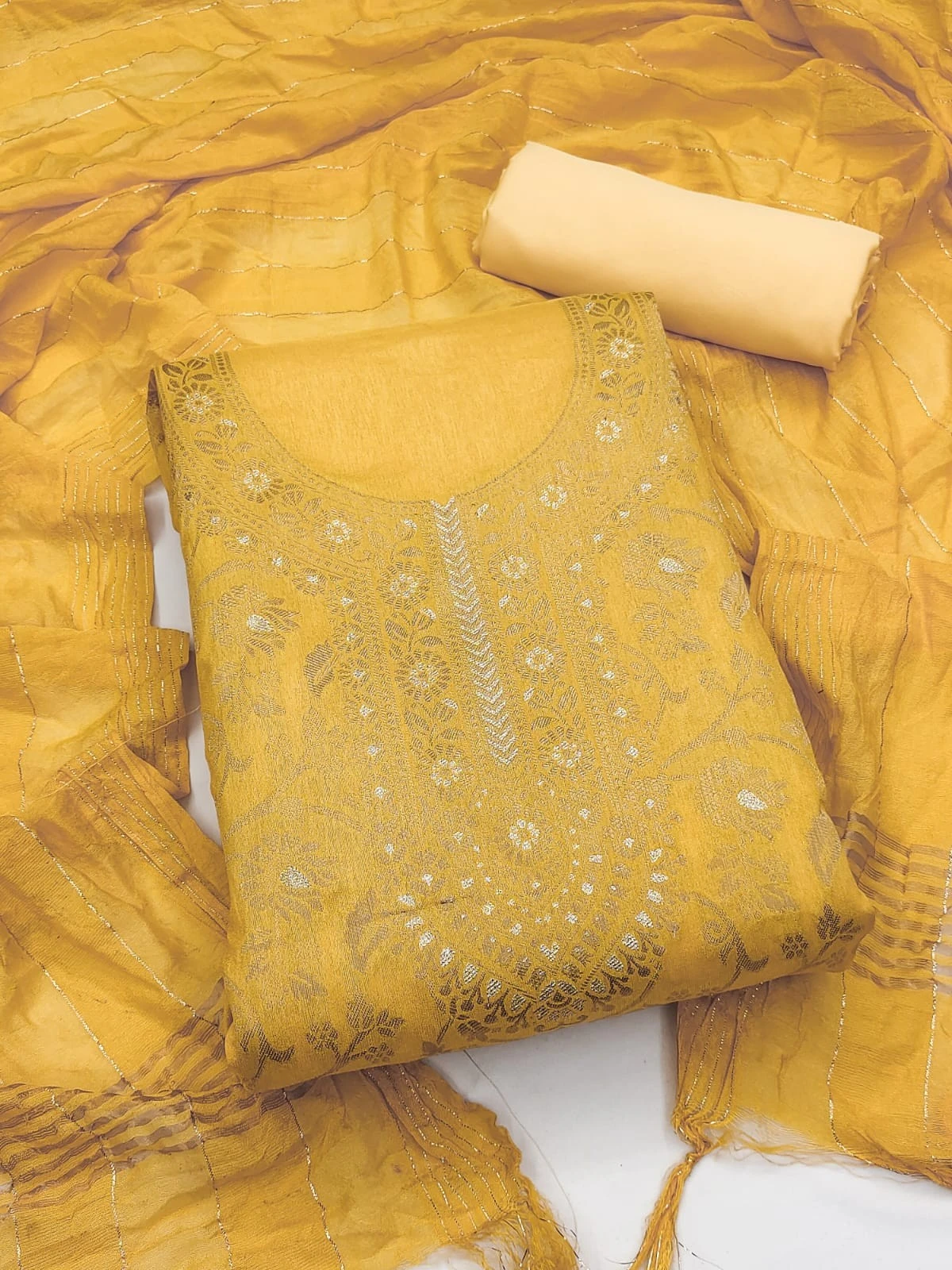 3. Dupatta Fabric (2.2 meters): Adorned with the same exquisite jacquard design as the top fabric, the Chanderi silk dupatta adds a touch of opulence to the ensemble. Its generous length allows for various draping styles, adding flair to your look.