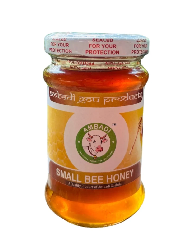 Ambadi goshala’s small bee honey produced by smaller species of bees, such as stingless bees (Meliponini). Contains vitamins, minerals, antioxidants, and enzymes, small bee honey is known for its natural antimicrobial properties, which can support wound healing and boost overall immune health. Used as a natural sweetener in beverages, baked goods, dressings, and marinades. Used in various traditional medicine practices for its potential health benefits, including soothing sore throats and digestive ailments. Applied topically in skincare products for its moisturizing and antibacterial properties. Individuals with allergies to bee products should exercise caution when consuming or using small bee honey.
