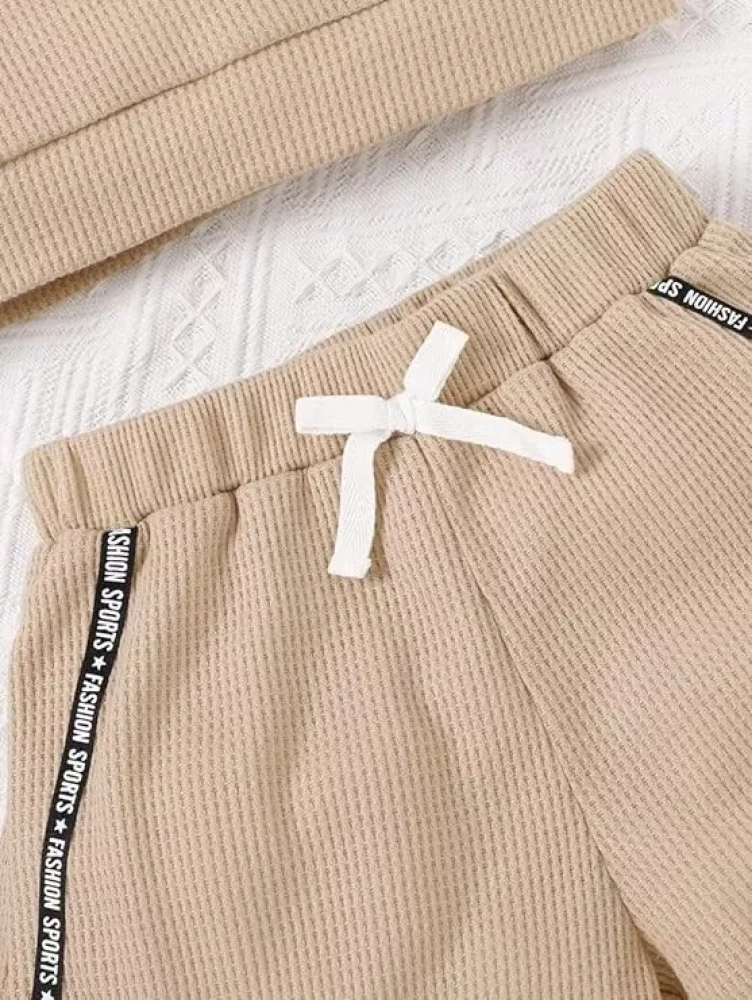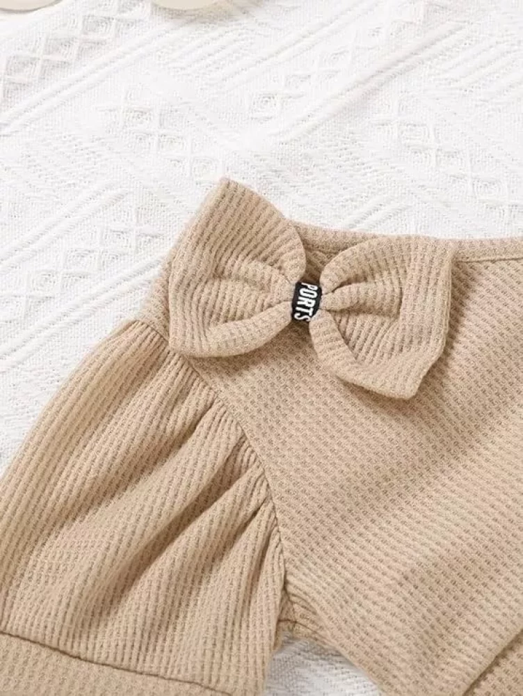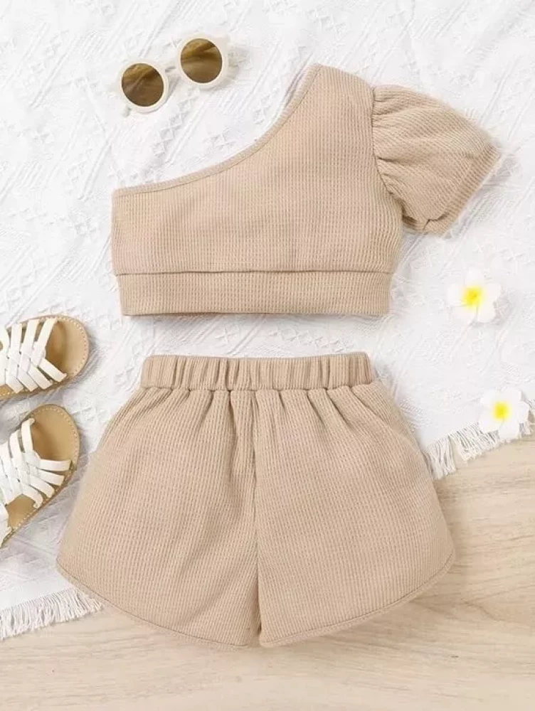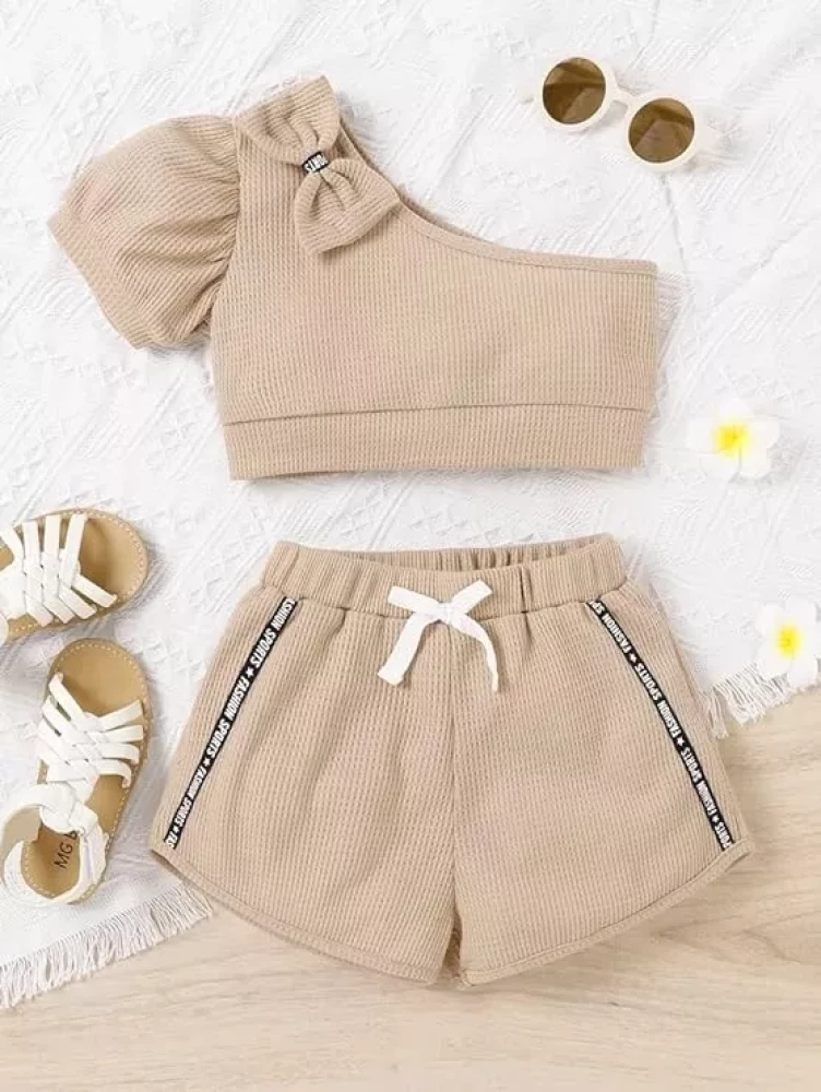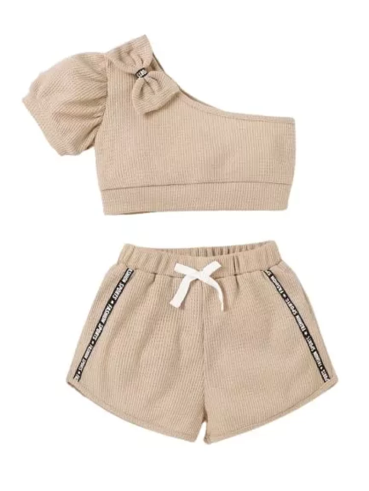 Ameeha Girls One Shoulder Bow Decor Khaki Crop Top and Track Shorts Set