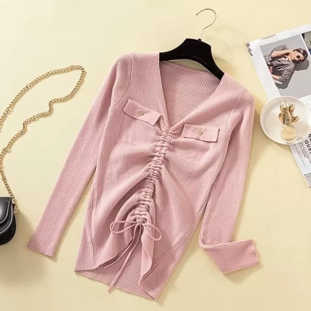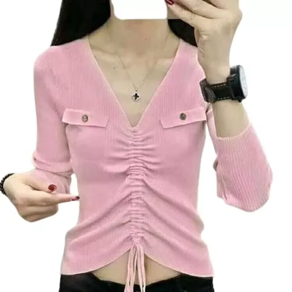 Ameeha Stylish Womens Long Sleeve V Neck Pink Top