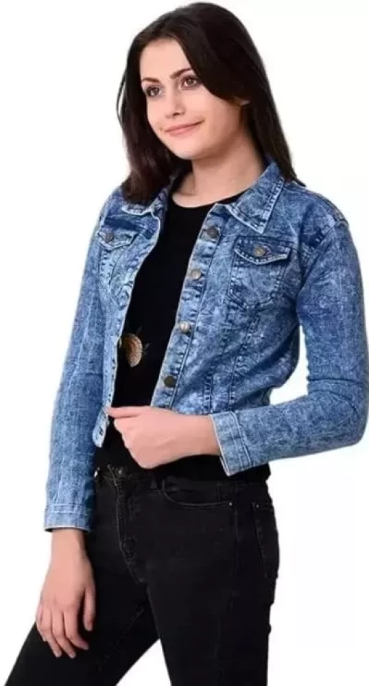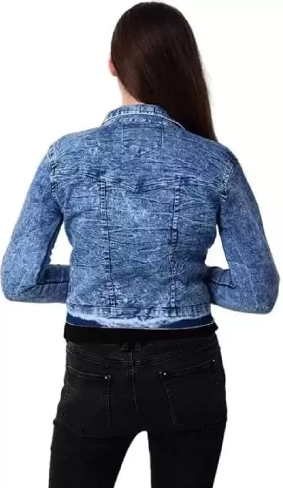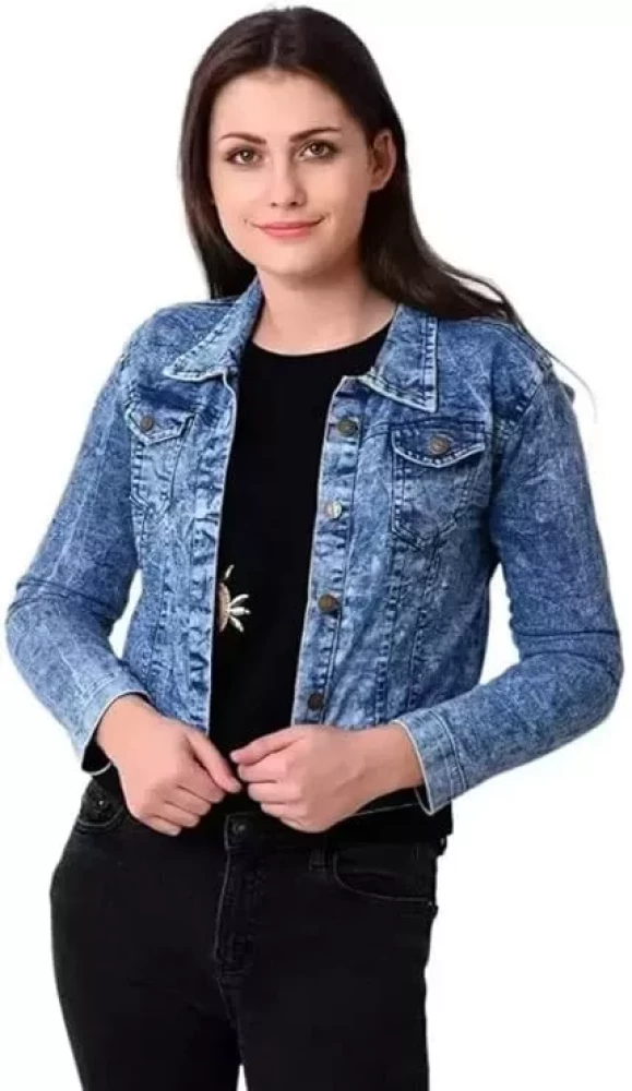 Ameeha Womens Collared Full Sleeves Solid Buttoned Cotton Denim Blue Jacket
