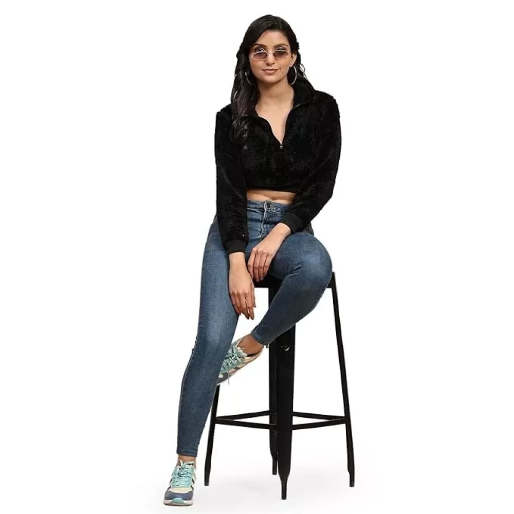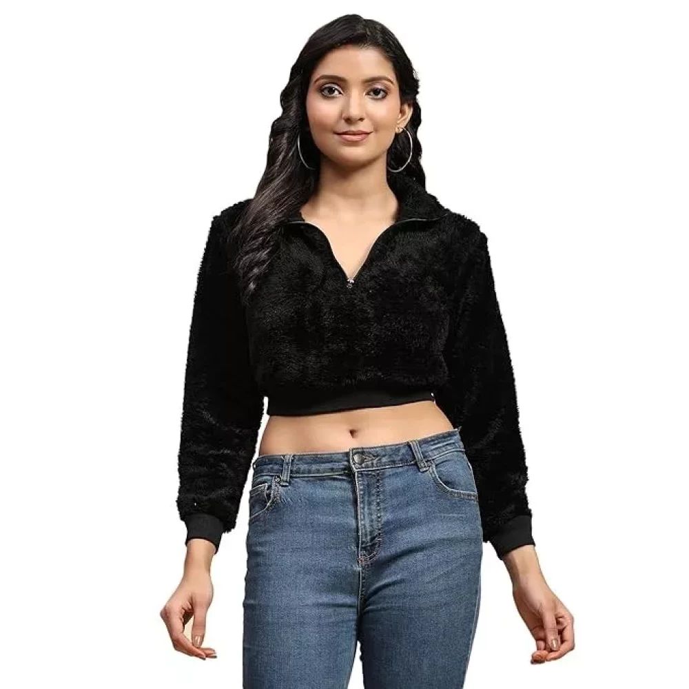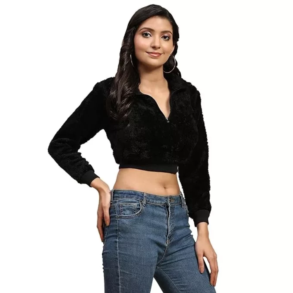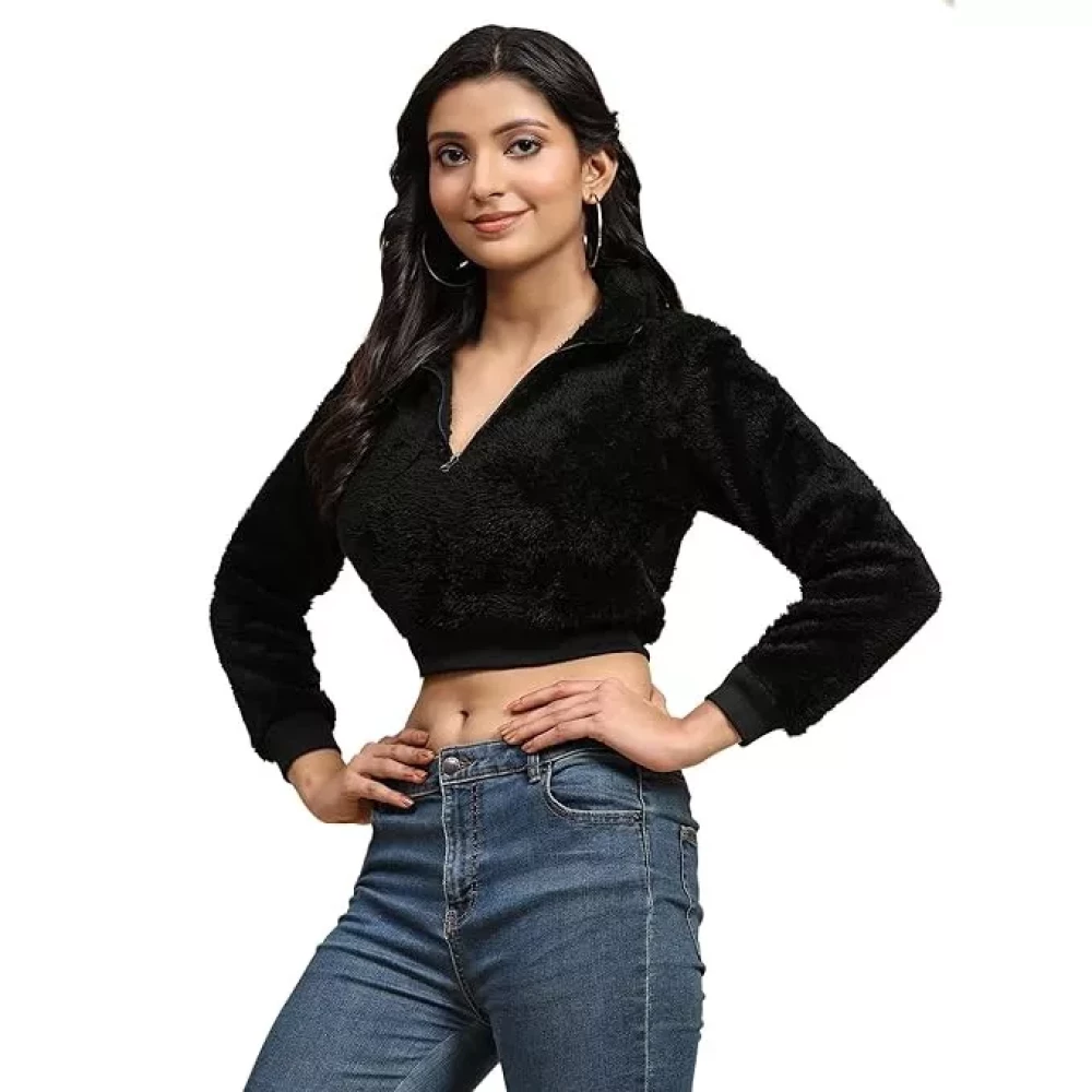 Ameeha Womens Western Cropped Tops Long Sleeves Half Zipper Black Sweatshirt