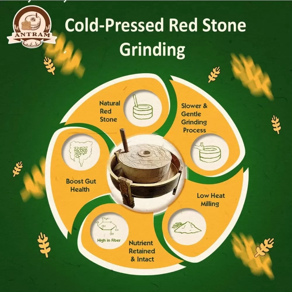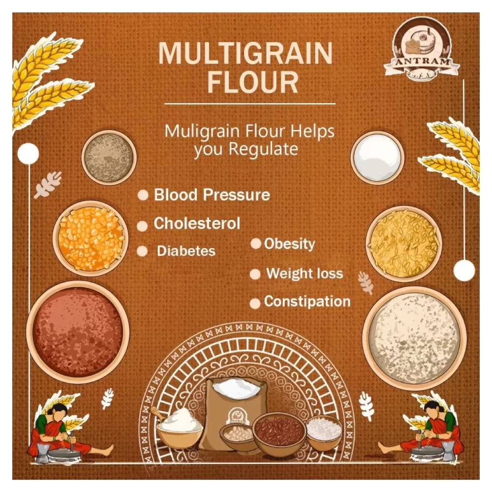 Mutlgrain Atta from Antram Foods is a wholesome blend designed to offer a rich source of nutrition and flavor, combining the goodness of traditional grains and legumes. This unique flour is made with 50% Sharbati MP Whole Wheat, renowned for its quality and taste, and is complemented by a carefully selected mix of 27% millets (including Jowar, Bajra, and Ragi), balance with nutritious soybeans and fenugreek seeds. Our cold pressing technique preserves the natural nutrients and flavors of the grains, making this atta a healthful choice for your family.
