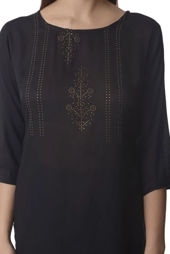 Woman Black Solid 100% Cotton Blend Kurta With Embroidery