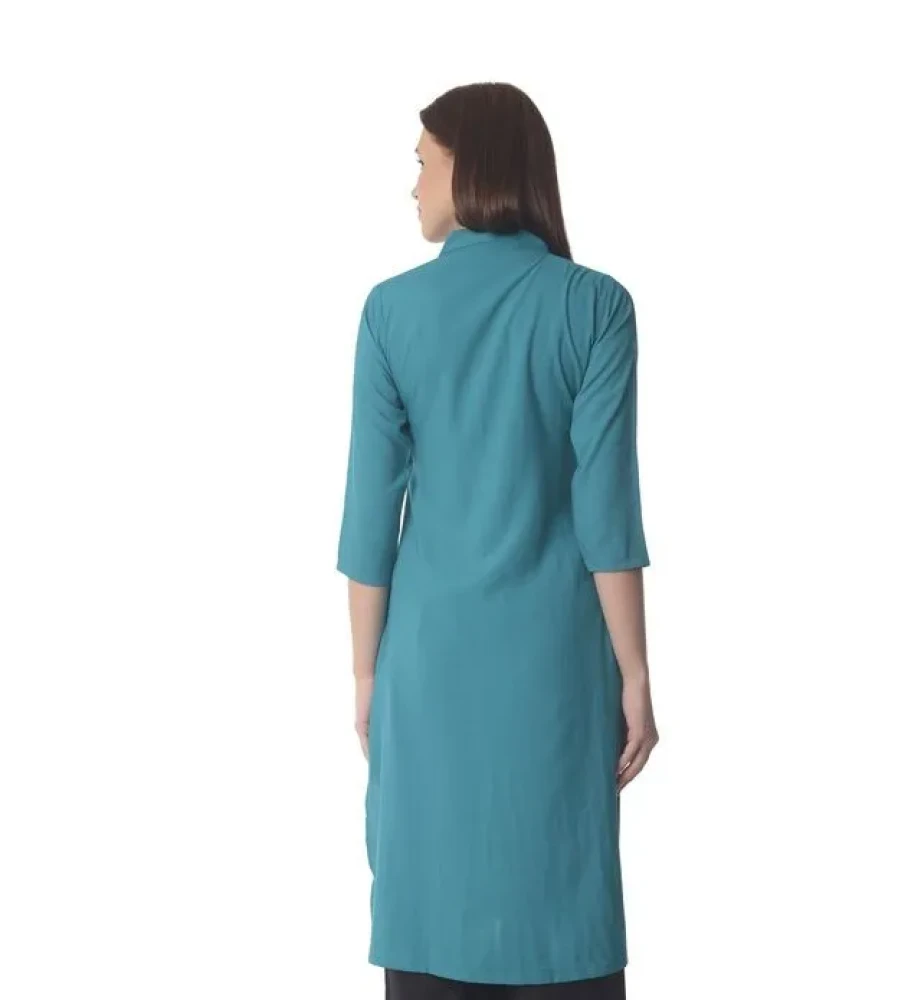 The classic Blue color and straight silhouette lend a versatile charm that effortlessly transitions from day to evening. Designed with a stylish shirt collar, this knee-length kurta offers a polished look that is both chic and comfortable.