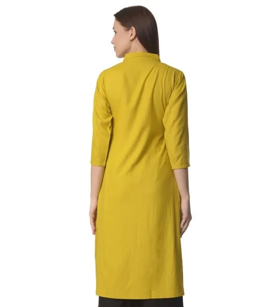 The classic Dark Yellow color and straight silhouette lend a versatile charm that effortlessly transitions from day to evening. Designed with a stylish shirt collar, this knee-length kurta offers a polished look that is both chic and comfortable.
