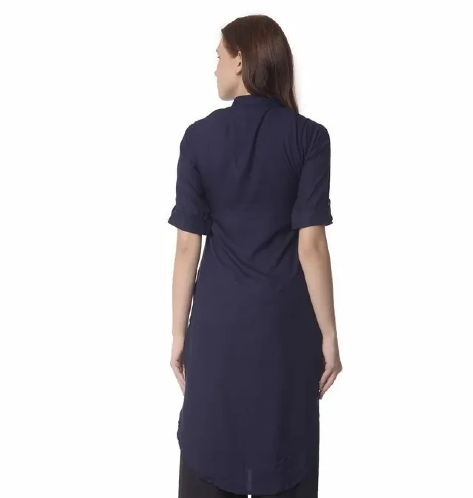 The soothing navy blue color and straight silhouette exude a relaxed yet sophisticated vibe, ideal for various casual occasions. Whether you're heading to a lunch date or running errands, this knee-length kurta ensures you look stylish and feel at ease.