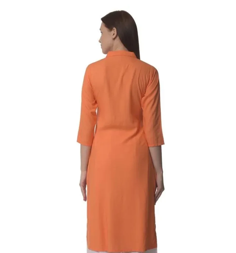 The classic Orange color and straight silhouette lend a versatile charm that effortlessly transitions from day to evening. Designed with a stylish shirt collar, this knee-length kurta offers a polished look that is both chic and comfortable.