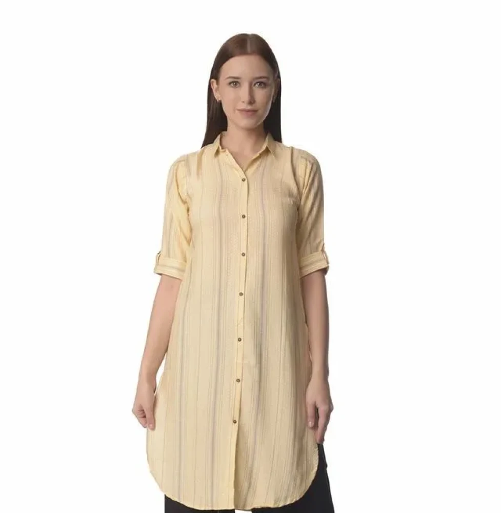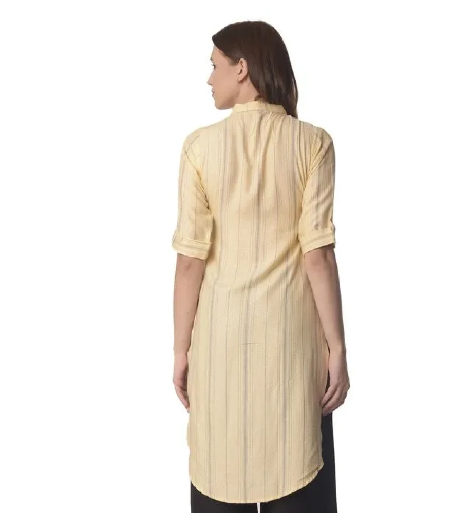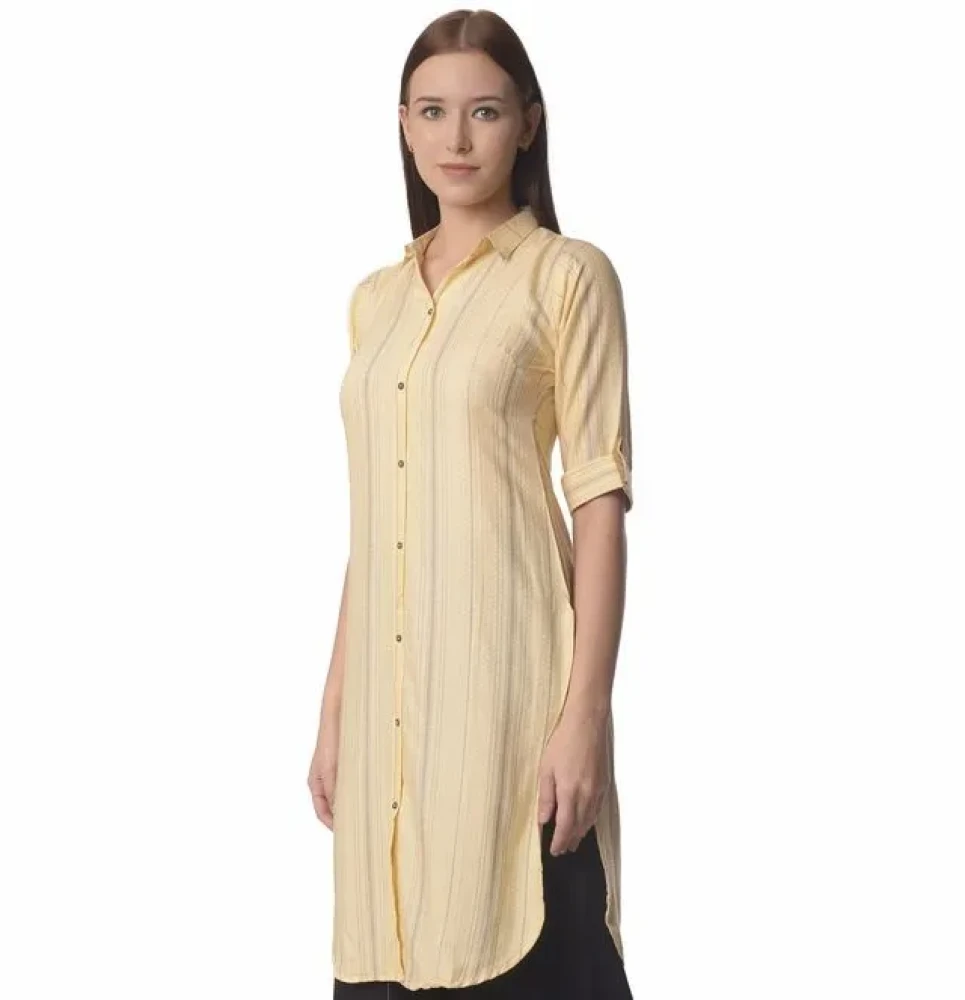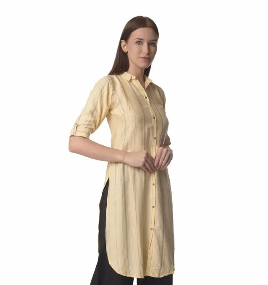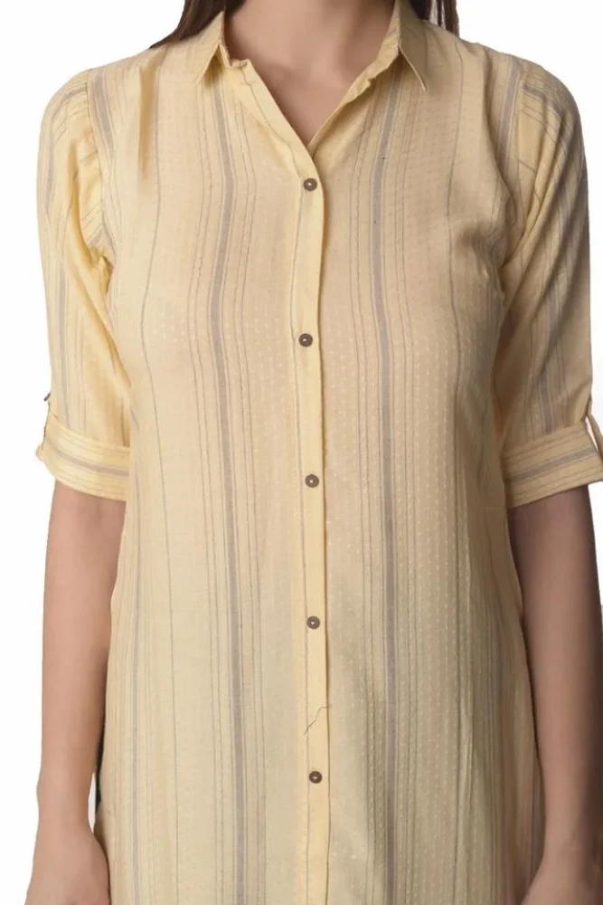 The classic Yellow  color and straight silhouette lend a versatile charm that effortlessly transitions from day to evening. Designed with a stylish shirt collar, this knee-length kurta offers a polished look that is both chic and comfortable.