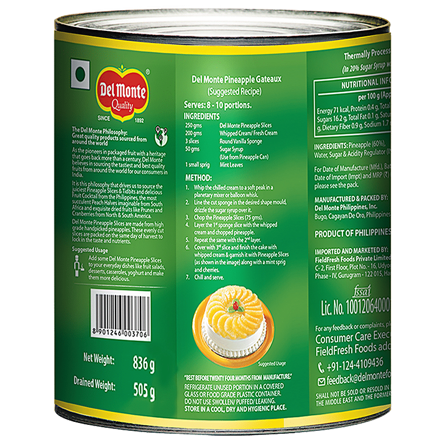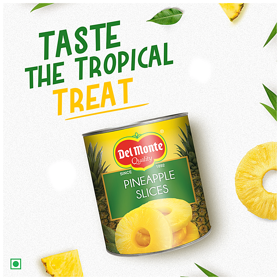 Born in 1886, Del Monte came to herald a whole new beginning in the production of path breaking canned products. Its canned fruits are especially well known worldwide. From peaches to mandarins and even fruit packages like the Fruit burst, these products are known for freshness and flavour. The Del Monte Pineapple Slices are one of the most products in this line up by Del Monte. Vegetarian, type of tin: tin, shelf life: 24 months, storage: Store in a cool, dry & hygienic place, away from direct heat & light.