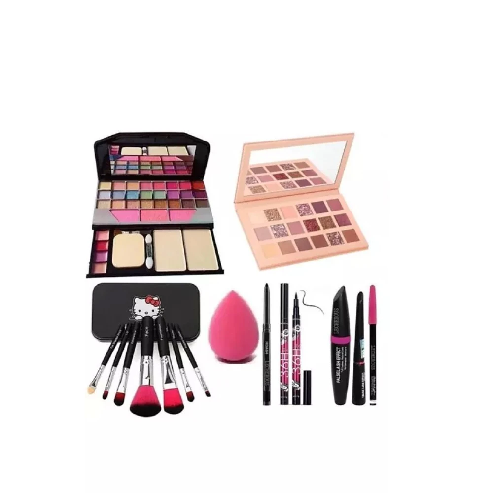 1. Product Composition: The Fancy Makeup Combo includes 1+1 Eyeshadow, 1 Eyeliner, 1 Kajal, 1 Makeup Puff, and Hello Kitty Makeup Brushes, all complemented by a 3-in-1 Mascara. This comprehensive set provides everything you need for captivating eye makeup.